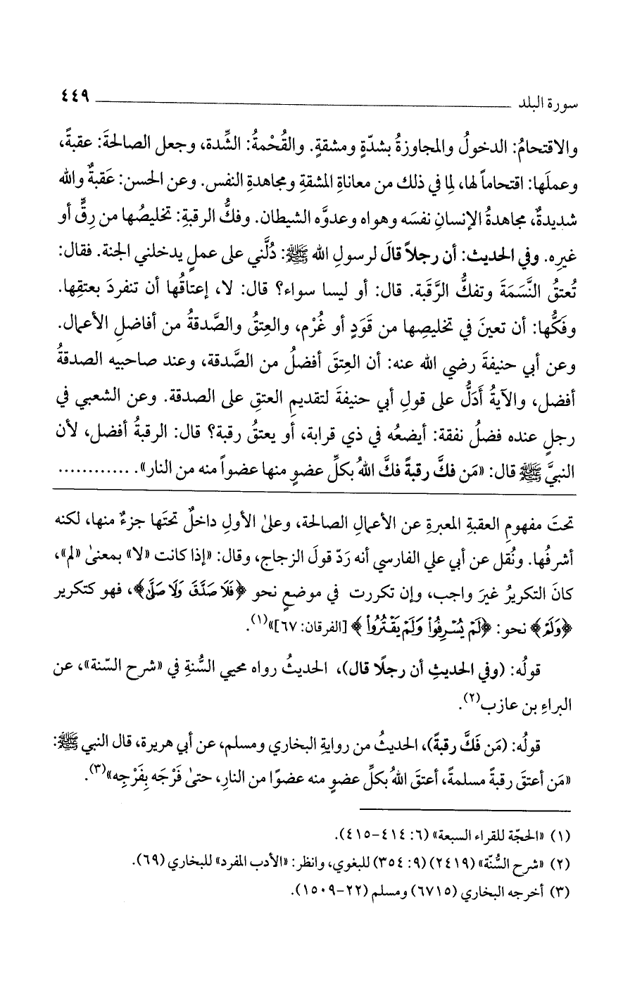 تحت مفهوم العقبة المعبرة عن الأعمال الصالحة، وعلى الأول داخل تحتها جزء منها، لكنه أشرفها. ونُقل عن أبي على الفاري أنه رد قول الزجاج، وقال: "إذا كانت "لا" بمعنى "لم"، كان التكرير غير واجب، وإن تكررت في موضع نحو {فَلَا صَدَّقَ وَلَا صَلَّى}، فهو كتكرير {وَلَمْ} نحو: {لَمْ يُسْرِفُوا وَلَمْ يَقْتُرُوا} [الفرقان: 67] ".