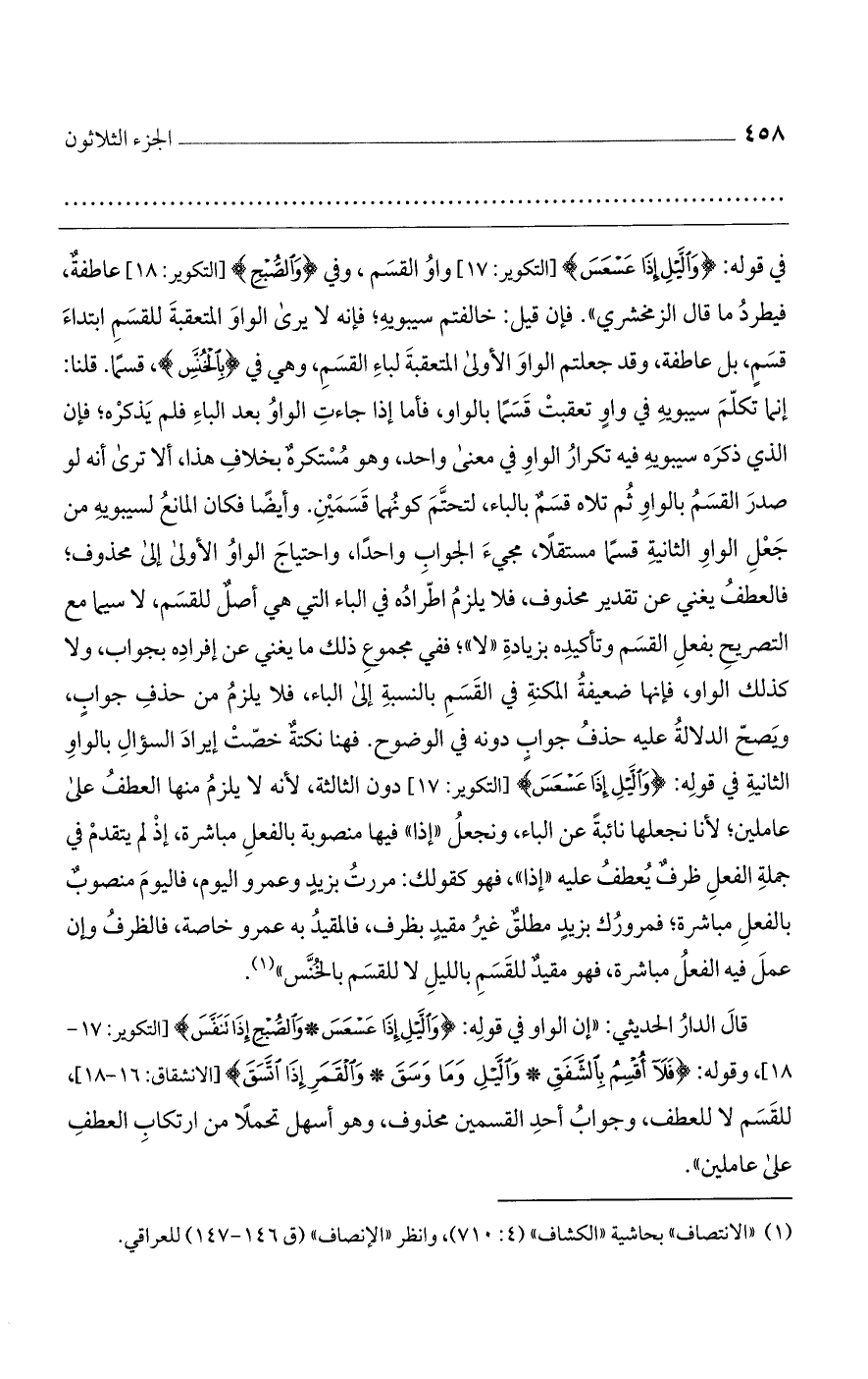 قال الدار الحديثي: "إن الواو في قوله: {وَالَّيْلِ إِذَا عَسْعَسَ (وَالصُّبْحِ إِذَا تَنَفَّسَ} [التكوير: 17 - 18]، وقوله: {فَلَا أُقْسِمُ بِالشَّفَقِ (وَالَّيْلِ وَمَا وَسَقَ (وَالْقَمَرِ إِذَا اتَّسَقَ} [الانشقاق: 16 - 18]، للقسم لا للعطف، وجواب أحد القسمين محذوف، وهو أسهل تحملاً من ارتكاب العطف على عاملين".