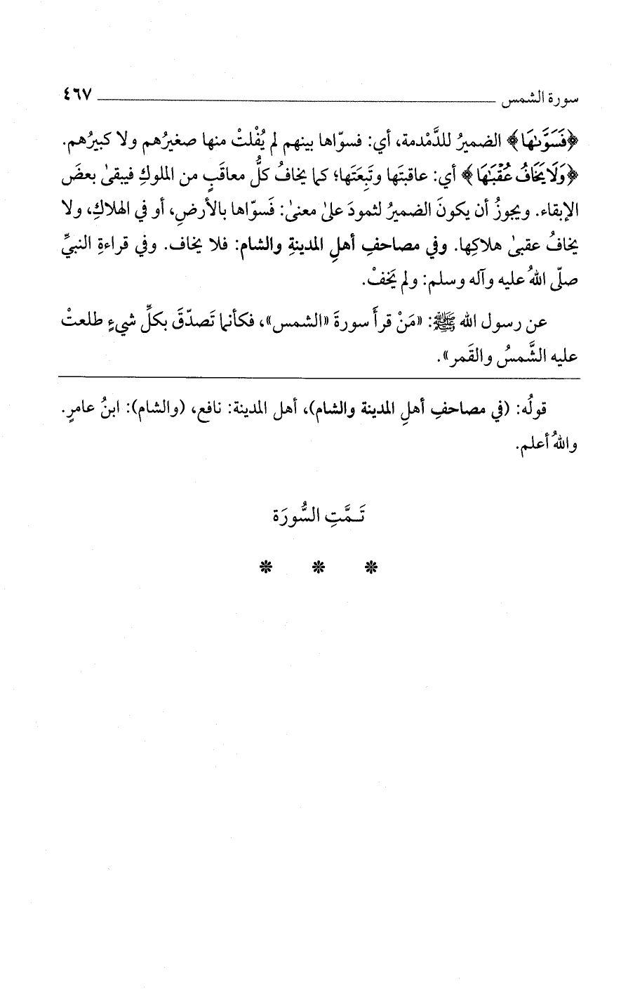 (فَسَوَّاها) الضمير للدمدمة، أي: فسوّاها بينهم لم يفلت منها صغيرهم ولا كبيرهم. (وَلا يَخافُ عُقْباها) أي: عاقبتها وتبعتها؛ كما يخاف كل معاقٍب من الملوك فيبقى بعض الإبقاء. ويجوز أن يكون الضمير لثمود على معنى: فسواها بالأرض، أو في الهلاك، ولا يخاف عقبى هلاكها. وفي مصاحف أهل المدينة والشام: فلا يخاف. وفي قراءة النبي صلى الله عليه وآله وسلم: ولم يخف.