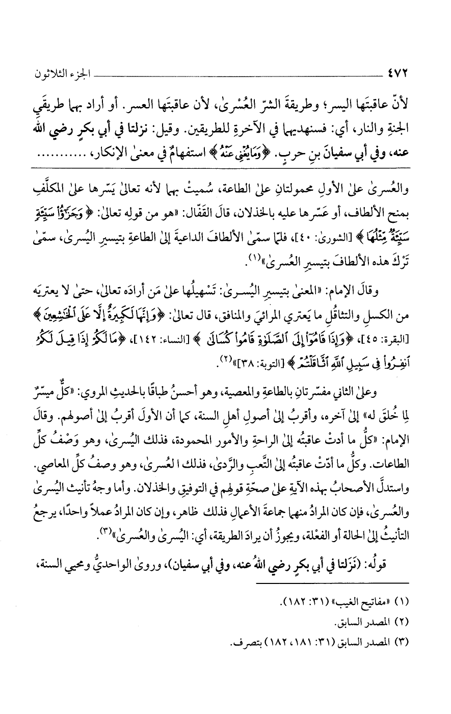 وعلى الثاني مفسرتان بالطاعة والمعصية، وهو أحسن طباقاً بالحديث المروي: "كل ميسر لما خُلق له" إلى آخره، وأقرب إلى وصول أهل السنة، كما أن الأول أقرب إلى أصولهم. وقال الإمام: "كل ما أدت عاقبته إلى الراحة والأمور المحمودة، فذلك اليُسرى، وهو وصف كل الطاعات. وكل ما أدت عاقبته إلى التعب والردى، فذلك العُسرى، وهو وصف كل المعاصي. واستدل الأصحاب بهذه الآية على صحة قولهم في التوفيق والخذلان. وأما وجه تأنيث اليُسرى والعُسرى، فإن كان المراد منهما جماعة الأعمال فذلك طاهر، وإن كان المراد عملاً واحداً، يرجع التأنيث إلى الحالة أو الفعلة، ويجوز أن يراد الطريقة، أي: اليُسرى والعُسرى".