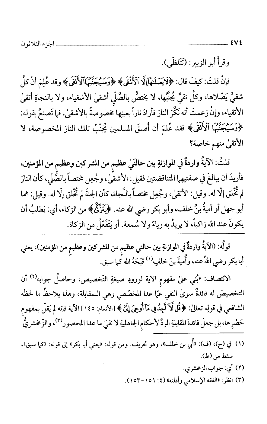 قوله: (الآية واردة في الموازنة بين حالتي عظيم من المشركين وعظيم من المؤمنين)، يعني أبا بكر رضي الله عنه، وأُمية بن خلف قبحه الله كما سبق.