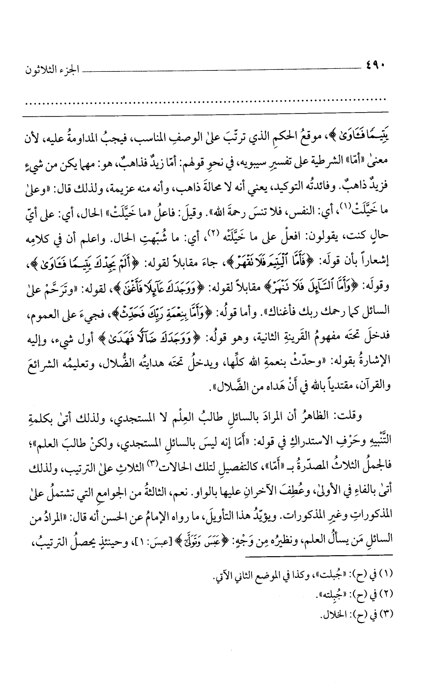 يَتِيمًا فَآوَى}، موقع الحكم الذي ترتب على الوصف المناسب، فيجب المداومة عليه، لأن معنى "أما" الشرطية على تفسير سيبويه، في نحو قولهم: أما زيد فذاهب، هو: مهما يكن من شيء فزيد ذاهب. وفائدته التوكيد، يعني أنه لا محالة ذاهب، وأنه منه عزيمة، ولذلك قال: "وعلى ما خَيَّلت، أي: النفس، فلا تنس رحمة الله". وقيل: فاعل "ما خَيَّلت" الحال، أي: على أي حال كنت، يقولون: افعل على ما خَيَّلته، أي: ما شُبهت الحال. واعلم أن في كلامه إشعاراً بأن قوله: {فَأَمَّا الْيَتِيمَ فَلَا تَقْهَرْ}، جاء مقابلاً لقوله: {أَلَمْ يَجِدْكَ يَتِيمًا فَآوَى}، وقوله: {وَأَمَّا السَّائِلَ فَلَا تَنْهَرْ}، مقابلاً لقوله: {وَوَجَدَكَ عَائِلًا فَأَغْنَى}، لقوله: "وترحم على السائل كما رحمك ربك فأغناك". وأما قوله: {وَأَمَّا بِنِعْمَةِ رَبِّكَ فَحَدِّثْ}، فجيء على العموم، فدخل تحته مفهوم القرينة الثانية، وهو قوله: {وَوَجَدَكَ ضَالًّا فَهَدَى} أول شيء، وإليه الإشارة بقوله: "وحدث بنعمة الله كلها، ويدخل تحته هدايته الضلال، وتعليمه الشرائع والقرآن، مقتدياً بالله في أن هداه من الضلال".