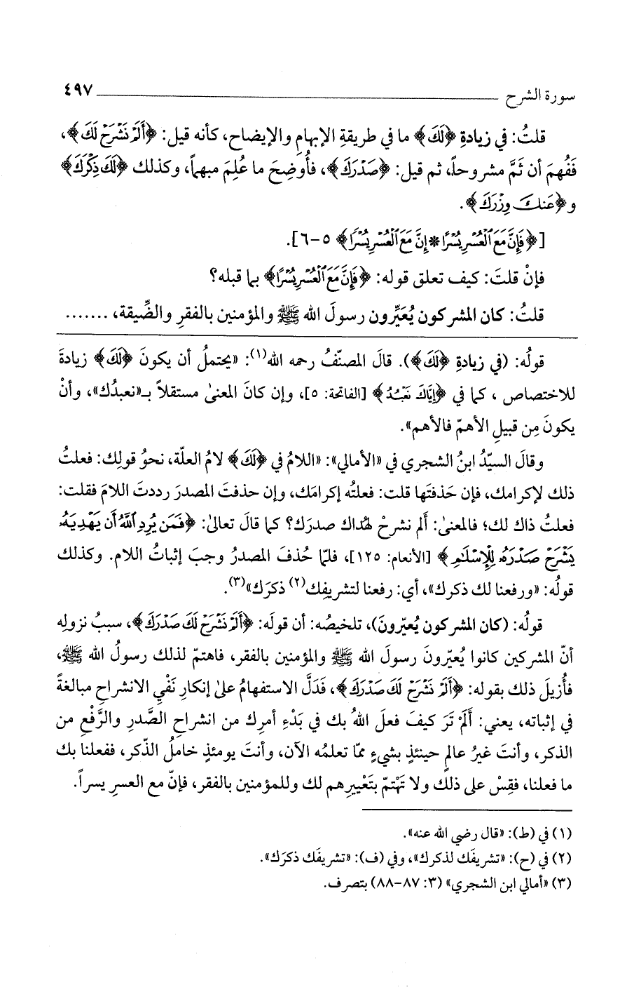 وقال السيد ابن الشجري في "الأمالي": "اللام في {لَكَ} لام العلة، نحو قولك: فعلت ذلك لإكرامك، فإن حذفتها قلت: فعلته إكرامك، وإن حذفت المصدر رددت اللام فقلت: فعلت ذلك لك؛ فالمعنى: ألم نشرح لهُداك صدرك؟ كما قال تعالى: {فَمَن يُرِدِ اللَّهُ أَن يَهْدِيَهُ يَشْرَحْ صَدْرَهُ لِلْإِسْلَامِ} [الأنعام: 125]، فلما حُذف المصدر وجب إثبات اللام. وكذلك قوله: "ورفعنا لك ذكرك"، أي: رفعنا لتشريفك ذكرك".