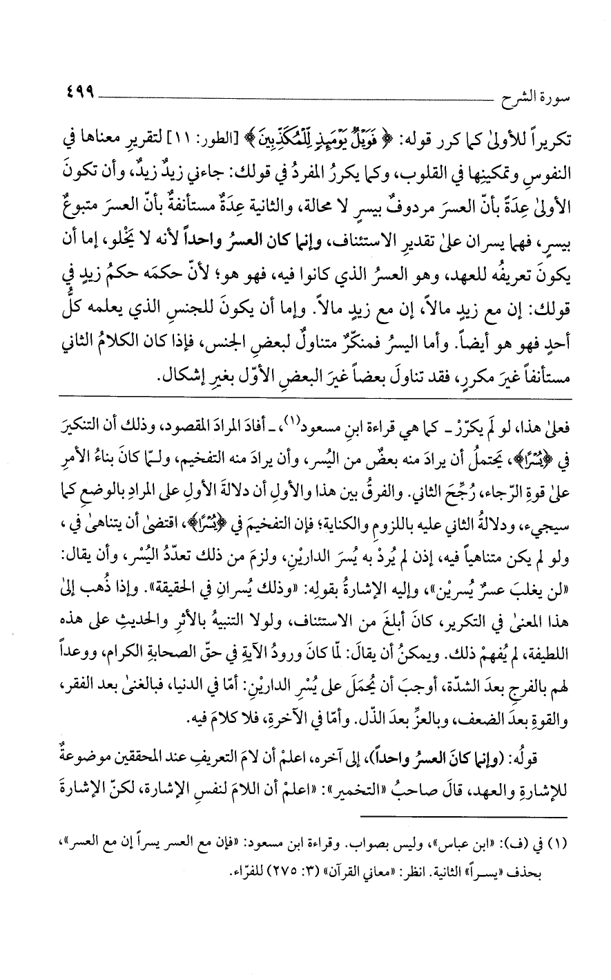 فعلى هذا، لو لم يكرر - كما هي قراءة ابن مسعود، - أفاد المراد المقصود، وذلك أن التنكير في {يُسْرًا}، يحتمل أن يراد منه بعض من اليسر، وأن يراد منه التفخيم، ولما كان بناء الأمر على قوة الرجاء، رُجح الثاني. والفرق بين هذا والأول أن دلالة الأول على المراد بالوضع كما سيجيء، ودلالة الثاني عليه باللزوم والكناية؛ فإن التفخيم في {يُسْرًا}، اقتضى أن يتناهي في، ولو لم يكن متناهياً فيه، إذن لم يُرد به يسر الدارين، ولزم من ذلك تعدد اليُسر، وأن يقال: "لن يغلب عسر يسرين"، وإليه الإشارة بقوله: "وذلك يُسران في الحقيقة". وإذا ذُهب إلى هذا المعني في التكرير، كان أبلغ من الاستئناف، ولولا التنبيه بالأثر والحديث على هذه اللطيفة، لم يفهم ذلك. ويمكن أن يقال: لما كان ورود الآية في حق الصحابة الكرام، ووعداً لهم بالفرج بعد الشدة، أوجب أن يُحمل على يسر الدارين: أما في الدنيا، فبالغنى بعد الفقر، والقوة بعد الضعف، وبالعز بعد الذل. وأما في الآخرة، فلا كلام فيه.
