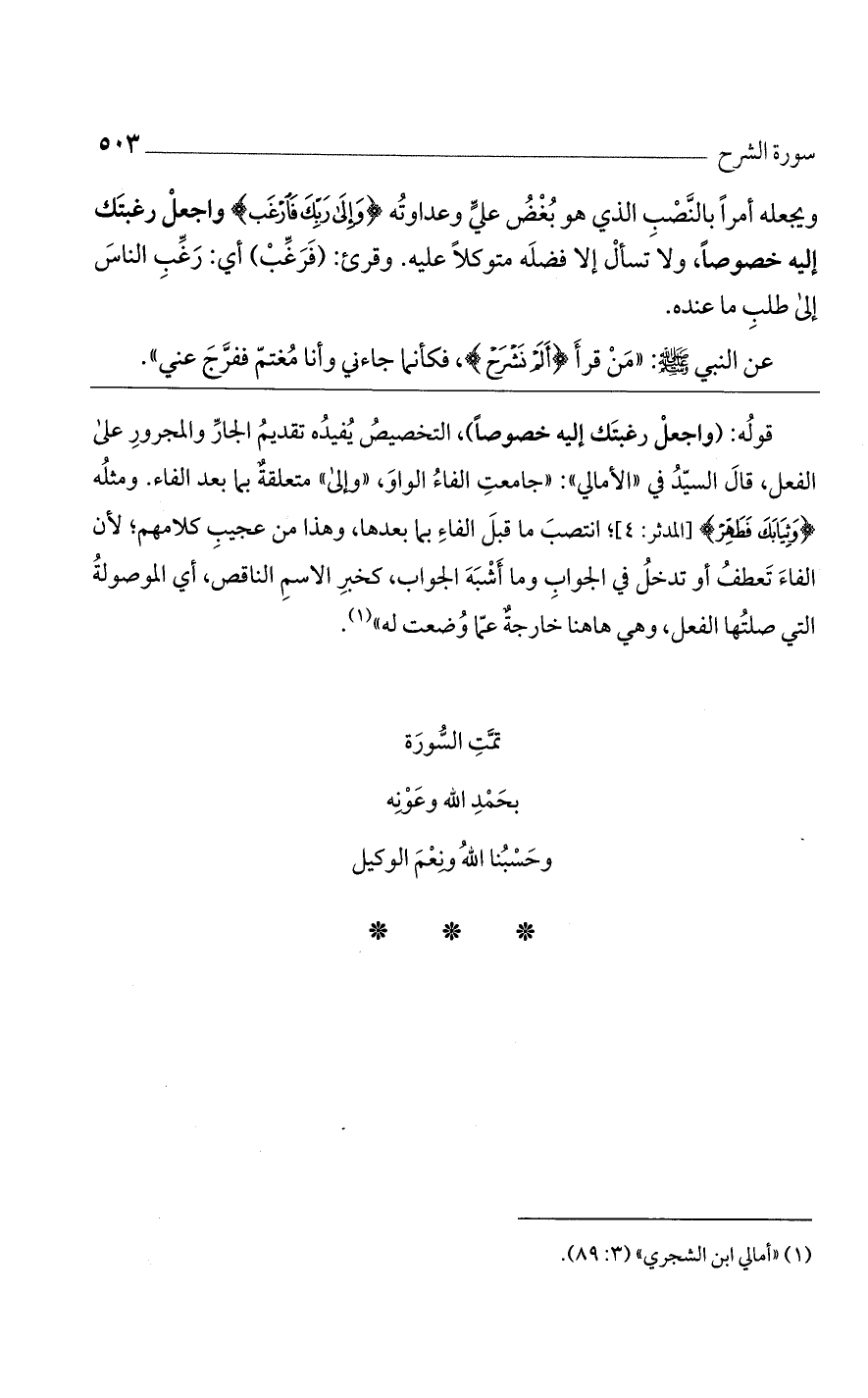 قوله: (واجعل رغبتك إليع خصوصاً)، التخصيص يفيده تقديم الجار والمجرور على الفعل، قال السيد في "الأمالي": "جامعت الفاء والواو، "وإلى" متعلقة بما بعد الفاء. ومثله {وَثِيَابَكَ فَطَهِّرْ} [المدثر: 4]؛ انتصب ما قبل الفاء بما بعدها، وهذا من عجيب كلامهم؛ لأن الفاء تعطف أو تدخل في الجواب وما أشبه الجواب، كخبر الاسم الناقص، أي الموصولة التي صلتها الفعل، وهي هاهنا خارجة عما وضعت له".