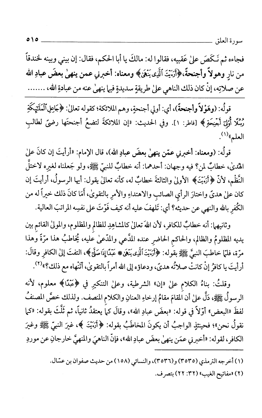 فجاءه ثم نكص على عقبيه، فقالوا له: مالك يا أبا الحكم، فقال: إن بيني وبينه لخندقًا من ناٍر وهولًا وأجنحةً، (أَرَأَيْتَ الَّذِي يَنْهى) ومعناه: أخبرني عمن ينهى بعض عباد الله عن صلاته، إن كان ذلك الناهي على طريقةٍ سديدةٍ فيما ينهى عنه من عبادة الله،
