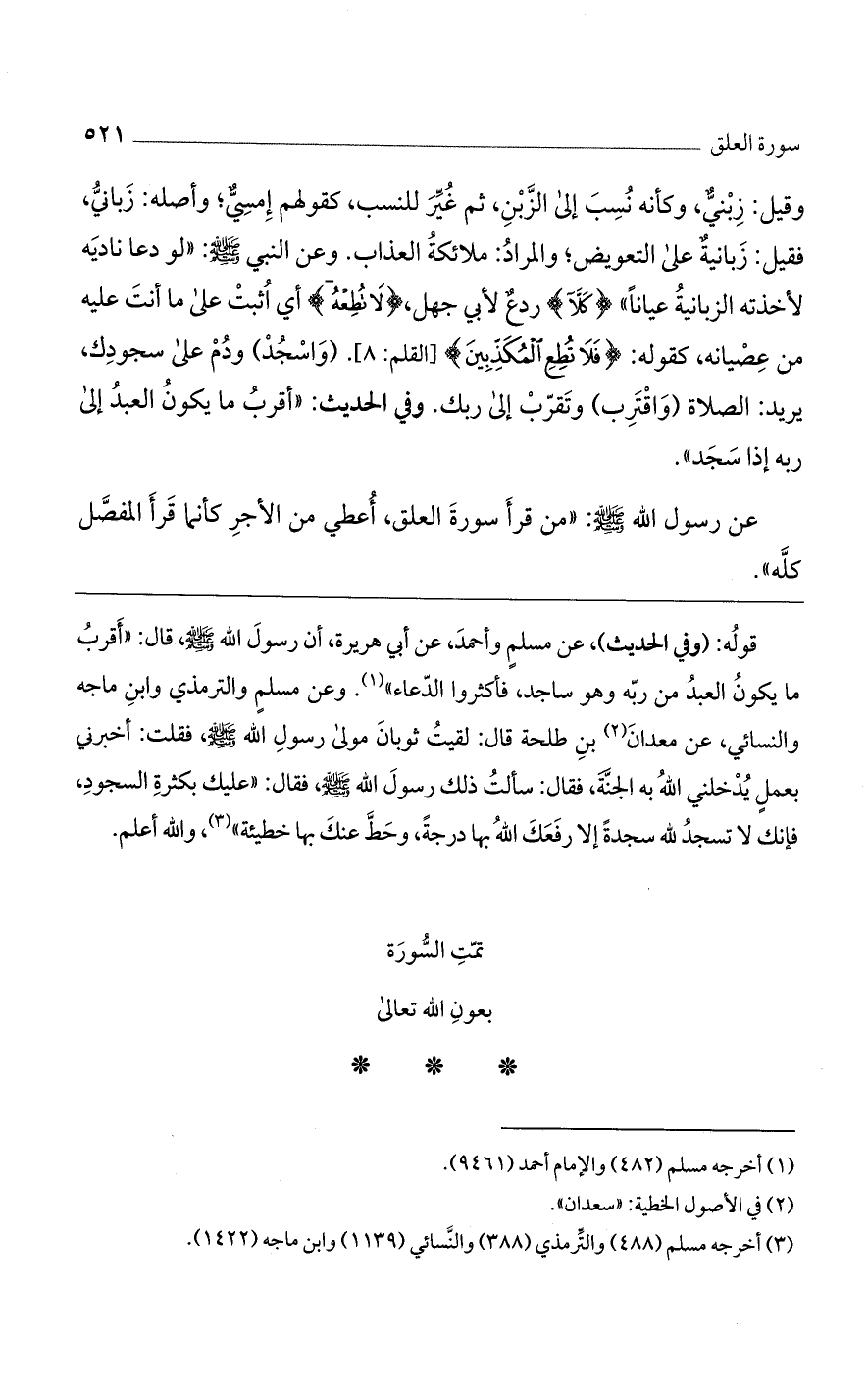 وقيل: زبني، وكأنه نسب إلى الزبن، ثم غير للنسب، كقولهم أمسيٌ، وأصله: زباني، فقيل: زبانية على التعويض؛ والمراد: ملائكة العذاب. وعن النبي صلى الله عليه وسلم: «لو دعا ناديه لأخذته الزبانية عيانا» (كَلَّا ردع) لأبى جهل، (لا تُطِعْهُ) أي اثبت على ما أنت عليه من عصيانه، كقوله: (فَلا تُطِعِ الْمُكَذِّبِينَ)] القلم: 8 [. (وَاسْجُدْ) ودم على سجودك، يريد: الصلاة (وَاقْتَرِبْ) وتقرّب إلى ربك. وفي الحديث: «أقرب ما يكون العبد إلى ربه إذا سجد».