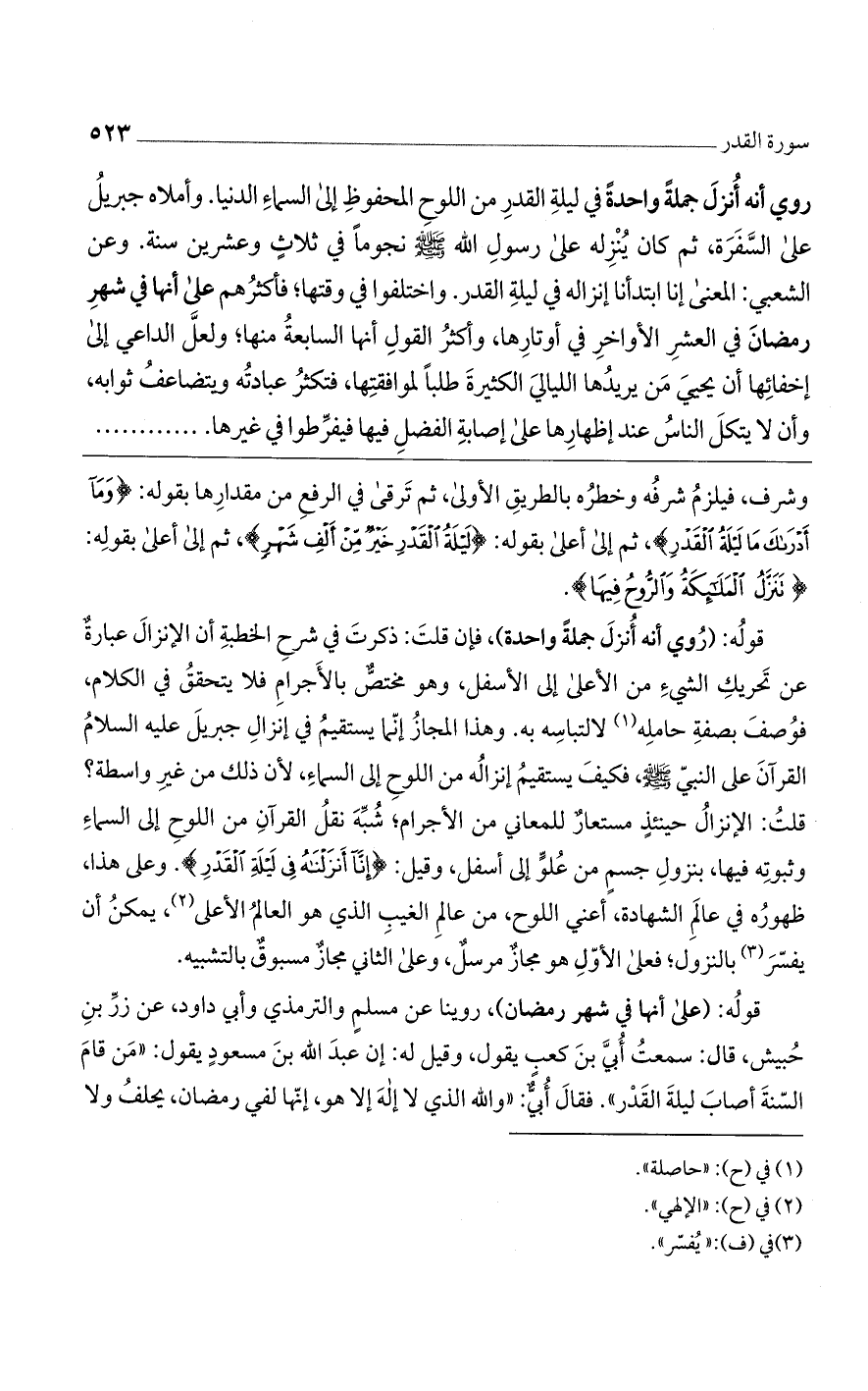 قوله: (روي أنه أُنزل جملة واحدة)، فإن قلت: ذكرت في شرح الخطبة أن الإنزال عبارة عن تحريك الشيء من الأعلى إلى الأسفل، وهو مختص بالأجرام فلا يتحقق في الكلام، فوصف بصفة حامله لالتباسه به. وهذا المجاز إنما يستقيم في إنزاله جبريل عليه السلام القرآن على النبي? ، فكيف يستقيم إنزاله من اللوح إلى السماء، لأن ذلك من غير واسطة؟ قلت: الإنزال حينئذ مستعار للمعاني من الأجرام؛ شُبِّه نقل القرآن من اللوح إلى السماء وثبوته فيها، بنزول جسم من عُلو إلى أسفل، وقيل: {إِنَّا أَنزَلْنَاهُ فِي لَيْلَةِ الْقَدْرِ}. وعلى هذا، ظهوره في عالم الشهادة، أعني اللوح، من عالم الغيب الذي هو العالم الأعلى، يمكن أن يفسر بالنزول؛ فعلى الأول هو مجاز مرسل، وعلى الثاني مجاز مسبوق بالتشبيه.