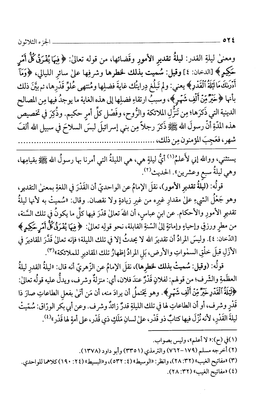 قوله: (ليلة تقدير الأمور)، نقل الإمام عن الواحدي أن القدر في اللغة بمعنى التقدير، وهو جعل الشيء على مقدار غيره من غير زيادة ولا نقصان. وقال: "سُميت به لأنها ليلة تقدير الأمور والأحكام. عن ابن عباس، أن الله تعالى قدر فيها كل ما يكون في تلك السنة، من مطر ورزق وإحياء وإماتة إلى السنة القابلة، نحو قوله تعالى: {فِيهَا يُفْرَقُ كُلُّ أَمْرٍ حَكِيمٍ} [الدخان: 4]. وليس المراد أن تقدير الله لا يحدث إلا في تلك الليلة؛ فإنه تعالى قدر المقادير في الأزل قبل خلق السموات والأرض، بل المراد إظهار تلك المقادير للملائكة".