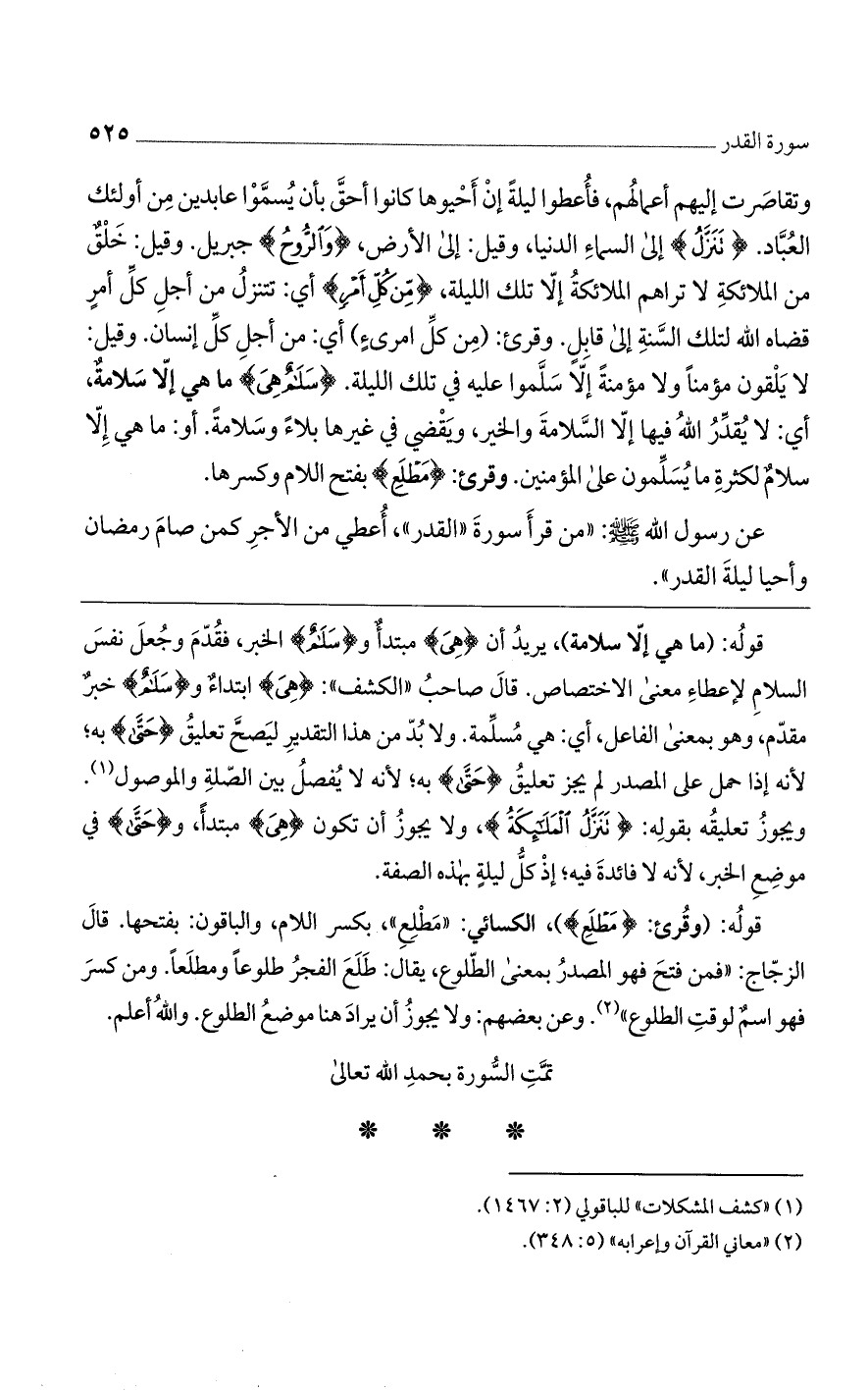قوله: (وقرئ: {مَطْلَعِ})، الكسائي: "مَطلع"، بكسر اللام، والباقون: بفتحها. قال الزجاج: "فمن فتح فهو المصدر بمعنى الطلوع، يقال: طلع الفجر طلوعاً ومطلعاً. ومن كسر فهو اسم لوقت الطلوع". وعن بعضهم: ولا يجوز أن يراد هنا موضع الطلوع. والله أعلم.