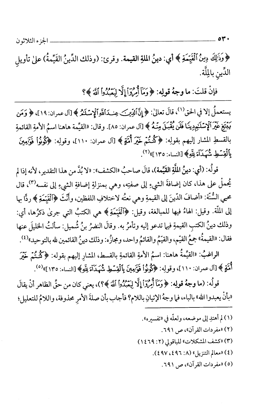 يستعمل إلا في الحق، قال تعالى: {إِنَّ الدِّينَ عِندَ اللَّهِ الْإِسْلَامُ} [آل عمران: 19]، {وَمَن يَبْتَغِ غَيْرَ الْإِسْلَامِ دِينًا فَلَن يُقْبَلَ مِنْهُ} [آل عمران: 85]. وقال: "القيمة هاهنا اسم الأمة القائمة بالقسط المشار إليهم بقوله: {كُنتُمْ خَيْرَ أُمَّةٍ} [آل عمران: 110]، وقوله: {كُونُوا قَوَّامِينَ بِالْقِسْطِ شُهَدَاءَ لِلَّهِ} [النساء: 135] ".