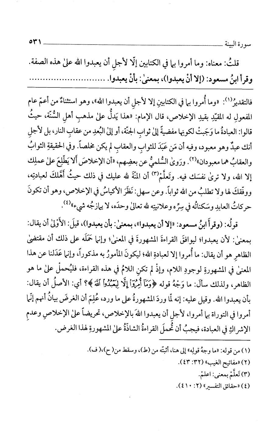فالتقدير: "وما أمروا بما في الكتابين إلا لأجل أن يعبدوا الله"، وهو استثناء من أعم عام المفعول له المقيد بقيد الإخلاص، قال الإمام: "هذا يدل على مذهب أهل السنة، حيث قالوا: العبادة ما وجبت لكونها مفضية إلى ثواب الجنة، أو إلى البُعد من عقاب النار، بل لأجل أنك عبد وهو معبود، وفيه أن من عبد للثواب والعقاب لم يكن مخلصاً. وفي الحقيقى الثواب والعقاب هما معبودان". وروى السُّلمي عن بعضهم، "أن الإخلاص ألا يطلع على عملك إلا الله، ولا ترى نفسك فيه. وتعلم أن المنة لله عليك في ذلك حيث أهلك لعبادته، ووفقك لها ولا تطلب من الله ثواباً. وعن سهل: نظر الأكياس في الإخلاص، وهو أن تكون حركات العابد وسكناته في سره وعلانيته لله تعالى وحده، لا يمازجه شيء".