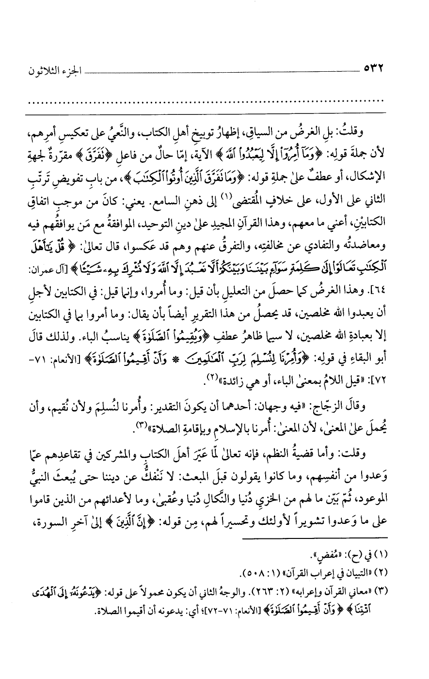 وقلت: بل الغرض من السياق، إظهار توبيخ أهل الكتاب، والنعي على تعكيس أمرهم، لأن جملة قوله: {وَمَا أُمِرُوا إِلَّا لِيَعْبُدُوا اللَّهَ} الآية، إما حال من فاعل {تَفَرَّقَ} مقررة لجهة الإشكال، أو عطف على جملة قوله: {وَمَا تَفَرَّقَ الَّذِينَ أُوتُوا الْكِتَابَ}، من باب تفويض ترتب الثاني على الأول، على خلاف المقتضي إلى ذهن السامع. يعني: كان من موجب اتفاق الكتابين، أعني ما معهم، وهذا القرآن المجيد على دين التوحيد، الموافقة مع من يوافقهم فيه ومعاضدته والتفادي عن مخالفته، والتفرق عنهم وهم قد عكسوا، قال تعالى: {قُلْ يَاأَهْلَ الْكِتَابِ تَعَالَوْا إِلَى كَلِمَةٍ سَوَاءٍ بَيْنَنَا وَبَيْنَكُمْ أَلَّا نَعْبُدَ إِلَّا اللَّهَ وَلَا نُشْرِكَ بِهِ شَيْئًا} [آل عمران: 64]. وهذا الغرض كما حصل من التعليل بأن قيل: وما أُمروا، وإنما قيل: في الكتابين لأجل أن يعبدوا الله مخلصين، قد يحصل من هذا التقرير أيضاً بأن يقال: وما أمروا بما في الكتابين إلا بعبادة الله مخلصين، لاسيما ظاهر عطف {وَيُقِيمُوا الصَّلَاةَ} يناسب الباء. ولذلك قال أبو البقاء في قوله: {وَأُمِرْنَا لِنُسْلِمَ لِرَبِّ الْعَالَمِينَ (وَأَنْ أَقِيمُوا الصَّلَاةَ} [الأنعام: 71 - 72]: "قيل اللام بمعنى الباء، أو هي زائدة".