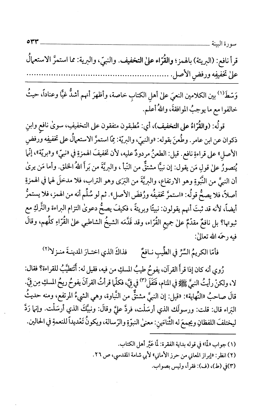 قوله: (والقُراء على التخفيف)، أي: مُطبقون متفقون على التخفيف، سوى نافع وابن ذكوان عن ابن عامر. وطُعن بقوله: "والنبي، والبرية: مما استمر الاستعمال على تخفيفه ورفض الأصل" على قراءة نافع. قيل: الطعن مردود عليه، لأن تخفيف الهمزة في "نبي" و"برية"، إنما يُتصور على قول من يقول: إن نبياً مشتق من النبأ، والبرية من برأ الله الخلق. وأما من يرى أن النبي من النبوة وهو الارتفاع، والبرية من البرى وهو التراب، فلا مدخل لهما في الهمزة أصلاً، فلا يصح قوله: "استمر تخفيفه ورُفض الأصل". ثم لو سُلم أنه من الهمز، فلا يستمر أيضاً، لأنه قد ثبت أنهم يقولون: نبيئاً وبريئة، فكيف يصح دعوى التزام البراءة والتَّرك مع ثبوتها؟ بل نافع مقدم على جميع القراء، وقد قدمه الشيخ الشاطبي على القُراء كلهم، وقال فيه رحمه الله تعالى: