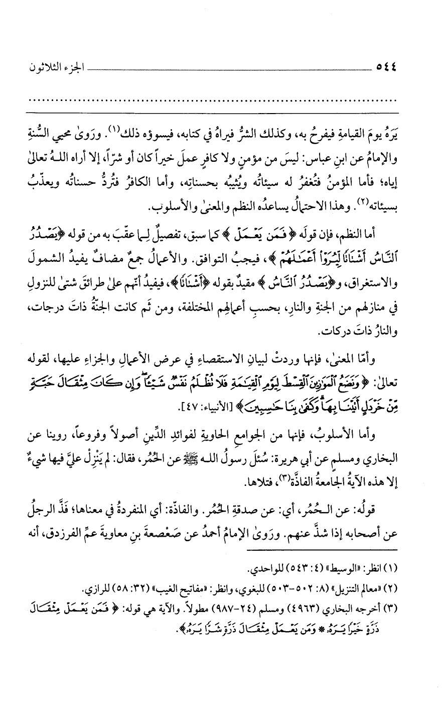 أما النظم، فإن قوله {فَمَن يَعْمَلْ} كما سبق، تفصيل لما عقب به من قوله {يَصْدُرُ النَّاسُ أَشْتَاتًا لِّيُرَوْا أَعْمَالَهُمْ}، فيجب التوافق. والأعمال جمع مضاف يفيد الشمول والاستغراق، {يَصْدُرُ النَّاسُ} مقيد بقوله {أَشْتَاتًا}، فيفيد أنهم على طرائق شتى للنزول في منازلهم من الجنة والنار، بحسب أعمالهم المختلفة، ومن ثم كانت الجنة ذات درجات، والنار ذات دركات.