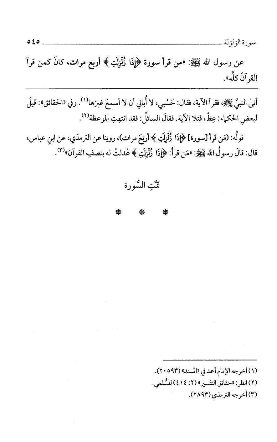 قوله: (من قرأ [سورة] {إِذَا زُلْزِلَتِ} أربع مرات، روينا عن الترمذي، عن ابن عباس، قال: قال رسول الله? : "من قرأ: {إِذَا زُلْزِلَتِ} عُدلت له بنف القرآن".