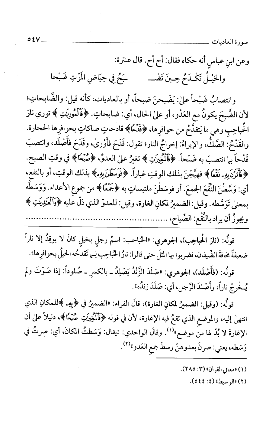 وانتصاب ضبحًا على: يضبحن ضبحًا، أو بالعاديات، كأنه قيل: والضابحات؛ لأن الضبح يكون مع العدو، أو على الحال، أي: ضابحات. (فَالْمُورِياتِ) تورى نار الحباحب وهي ما ينقدح من حوافرها، (قَدْحاً) قادحات صاكات بحوافرها الحجارة. والقدح: الصك، والإيراء: إخراج النار؛ تقول: قدح فأورى، وقدح فأصلد، وانتصب قدحًا بما انتصب به ضبحًا. (فَالْمُغِيراتِ) تغير على العدو، (صُبْحاً) في وقت الصبح. (فَأَثَرْنَ بِهِ نَقْعاً) فهيجن بذلك الوقت غبارًا. (فَوَسَطْنَ بِهِ) بذلك الوقت، أو بالنقع، أي: وسطن النقع الجمع. أو فوسطن ملتبسات به (جَمْعاً) من جموع الأعداء. ووسطه بمعنى توسطه. وقيل: الضمير لمكان الغارة، وقيل: للعدو الذي دلّ عليه (وَالْعادِياتِ) ويجوز أن يراد بالنقع: الصياح،