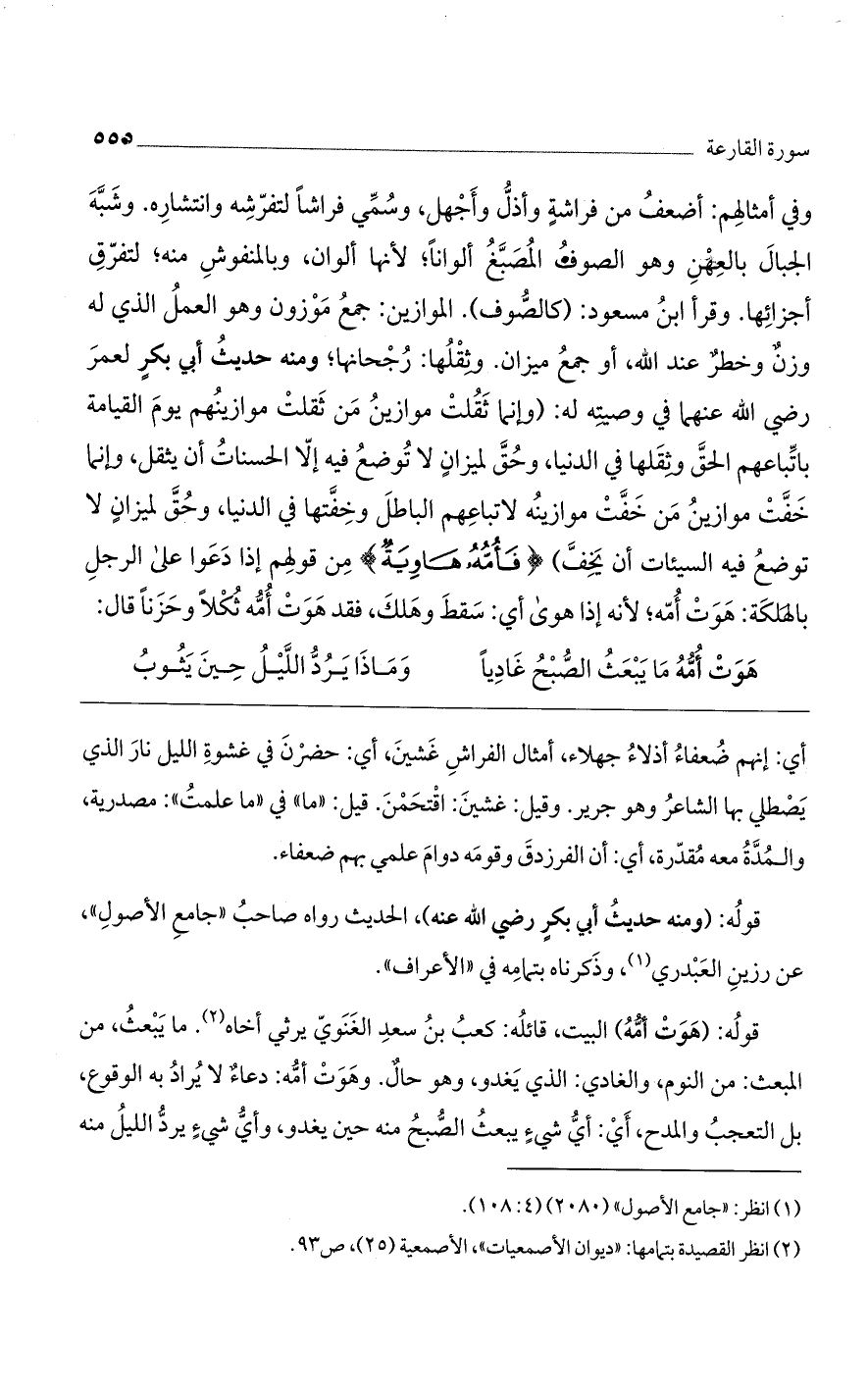 وفي أمثالهم: أضعف من فراشةٍ وأذل وأجهل، وسمى فراشًا لتفرّشه وانتشاره. وشبه الجبال بالعهن وهو الصوف المصبغ ألوانًا؛ لأنها ألوان، وبالمنفوش منه؛ لتفرق أجزائها. وقرأ ابن مسعود: (كالصوف). الموازين: جمع موزون وهو العمل الذي له وزن وخطر عند الله، أو جمع ميزان. وثقلها: رجحانها؛ ومنه حديث أبى بكر لعمر رضى الله عنهما في وصيته له: (وإنما ثقلت موازين من ثقلت موازينهم يوم القيامة باتباعهم الحق وثقلها في الدنيا، وحق لميزان لا توضع فيه إلا الحسنات أن يثقل، وإنما خفت موازين من خفت موازينه لاتباعهم الباطل وخفتها في الدنيا، وحق لميزان لا توضع فيه إلا السيئات أن يخف) (فَأُمُّهُ هاوِيَةٌ) من قولهم إذا دعوا على الرجل بالهلكة: هوت أمّه؛ لأنه إذا هوى أي: سقط وهلك، فقد هوت أمّه ثكلًا وحزنًا قال: