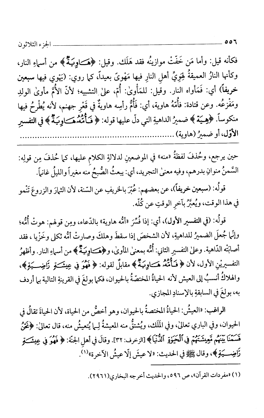 فكأنه قيل: وأما من خفت موازينه فقد هلك. وقيل: (هاوِيَةٌ) من أسماء النار، وكأنها النار العميقة لهوى أهل النار فيها مهوى بعيدًا، كما روى: (يهوى فيها سبعين خريفا) أي: فمأواه النار. وقيل: للمأوى: أمّ، على التشبيه؛ لأنّ الأمّ مأوى الولد ومفزعه. وعن قتادة: فأمّه هاوية، أي: فأمّ رأسه هاوية في قعر جهنم، لأنه يطرح فيها منكوسًا. (هِيَهْ) ضمير الداهية التي دلّ عليها قوله: (فَأُمُّهُ هاوِيَةٌ) في التفسير الأوّل، أو ضمير (هاوية)