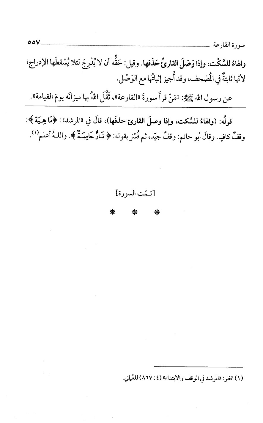 قوله: (والهاء للسَّكت، وإذا وصل القارئ حذفها)، قال في "المرشد": {مَا هِيَهْ}: وقف كاف. وقال أبو حاتم: وقف جيد، ثم فُسر بقوله: {نَارٌ حَامِيَةٌ}. والله أعلم.