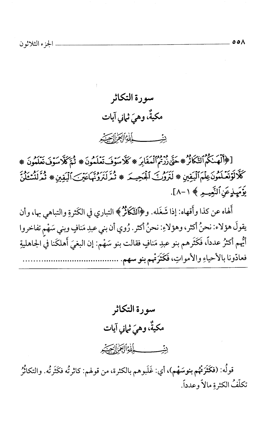 [(أَلْهاكُمُ التَّكاثُرُ (1) حَتَّى زُرْتُمُ الْمَقابِرَ (2) كَلاَّ سَوْفَ تَعْلَمُونَ (3) ثُمَّ كَلاَّ سَوْفَ تَعْلَمُونَ (4) كَلاَّ لَوْ تَعْلَمُونَ عِلْمَ الْيَقِينِ (5) لَتَرَوُنَّ الْجَحِيمَ (6) ثُمَّ لَتَرَوُنَّها عَيْنَ الْيَقِينِ (7) ثُمَّ لَتُسْئَلُنَّ يَوْمَئِذٍ عَنِ النَّعِيمِ)] 1 - 8 [.