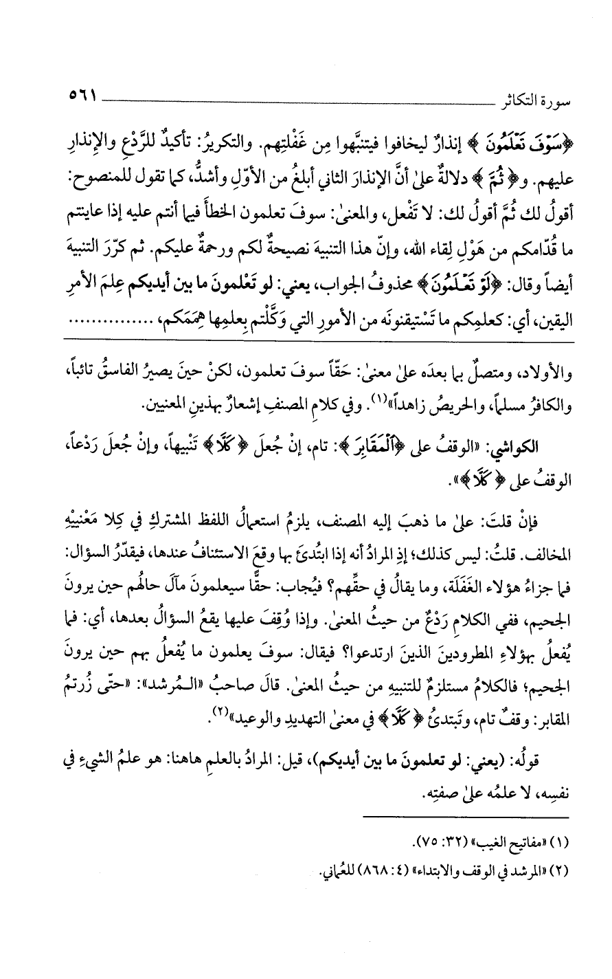 فإن قلت: على ما ذهب إليه المصنف، يلزم استعمال اللفظ المشترك في كلا معنييه المخالف. قلت: ليس كذلك؛ إذ المراد أنه إذا ابتدئ بها وقع الاستئناف عندها، فيقدر السؤال: فما جزاء هؤلاء الغفلة، وما يقال في حقهم؟ فيجاب: حقاً سيعلمون مآل حالهم حين يرون الجحيم، ففي الكلام ردع من حيث المعنى. وإذا وُقف عليها يقع السؤال بعدها، أي: فما يُفعل بهؤلاء المطرودين الذين ارتدعوا؟ فيقال: سوف يعلمون ما يُفعل بهم حين يرون الجحيم؛ فالكلام مستلزم للتنبيه من حيث المعنى. قال صاحب "المرشد": "حتى زرتم المقابر: وقف تام، وتبتدئ {كَلَّا} في معنى التهديد والوعيد".