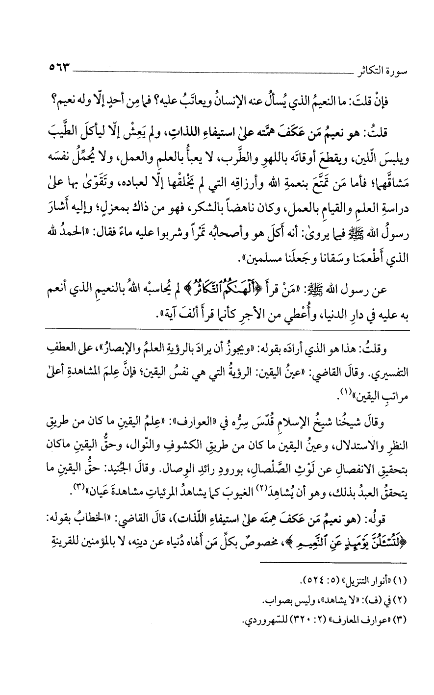 وقال شيخنا شيخ الإسلام قُدس سِره في "العوارف": "علم اليقين ما كان من طريق النظر والاستدلال، وعين اليقين ما كان من طريق الكشوف والنوال، وحق اليقين ما كان بتحقيق الانفصال عن لوث الصلصال، بورود رائد الوصال. وقال الجنيد: حق اليقين ما يتحقق العبد بذلك، وهو أن يُشاهد الغيوب كما يشاهد المرئيات مشاهدة عيان".