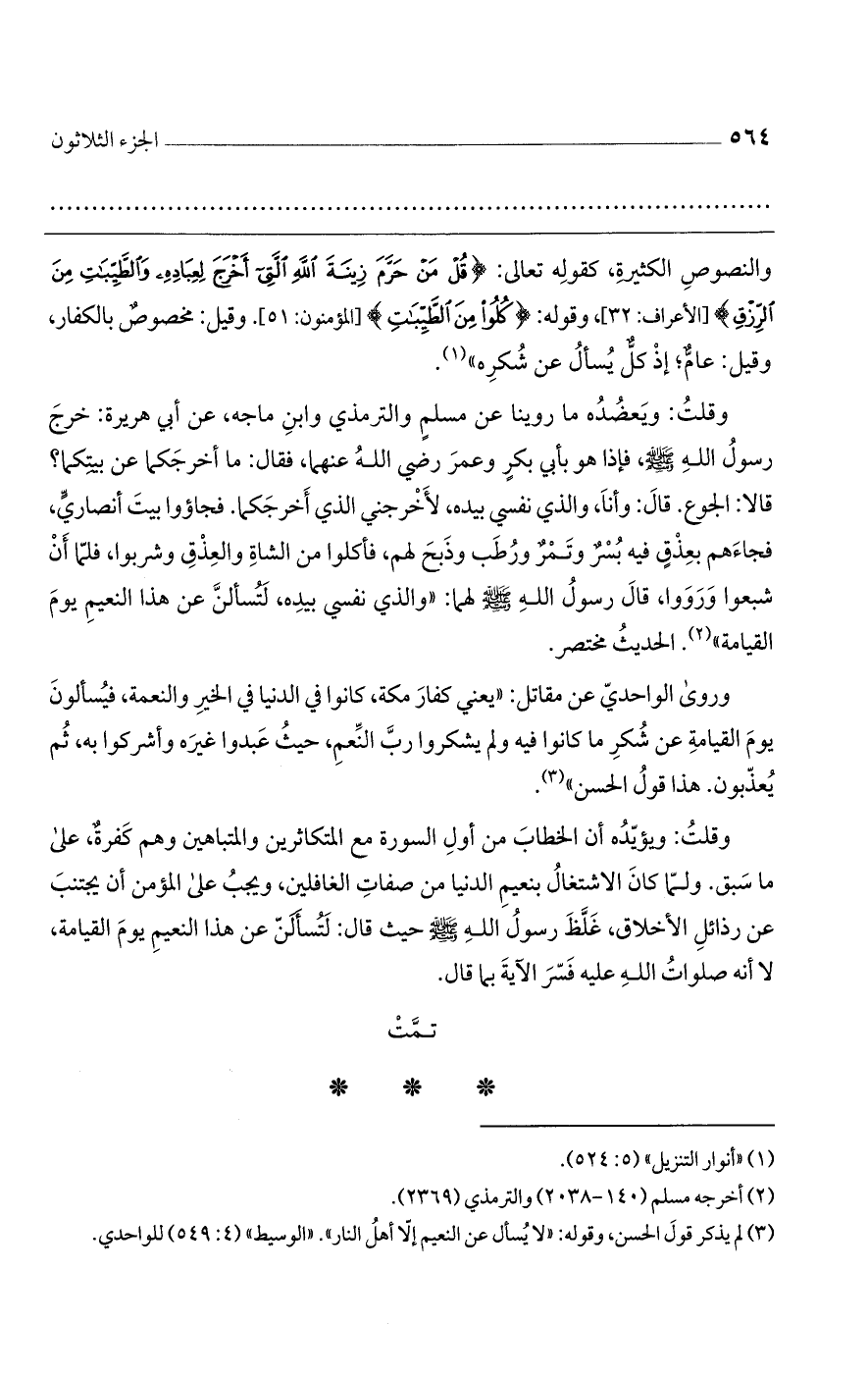 والنصوص الكثيرة، كقوله تعالى: {قُلْ مَنْ حَرَّمَ زِينَةَ اللَّهِ الَّتِي أَخْرَجَ لِعِبَادِهِ وَالطَّيِّبَاتِ مِنَ الرِّزْقِ} [الأعراف: 32]، وقوله: {كُلُوا مِنَ الطَّيِّبَاتِ} [المؤمنون: 51]. وقيل: مخصوص بالكفار، وقيل: عام؛ إذ كل يُسأل عن شُكره".