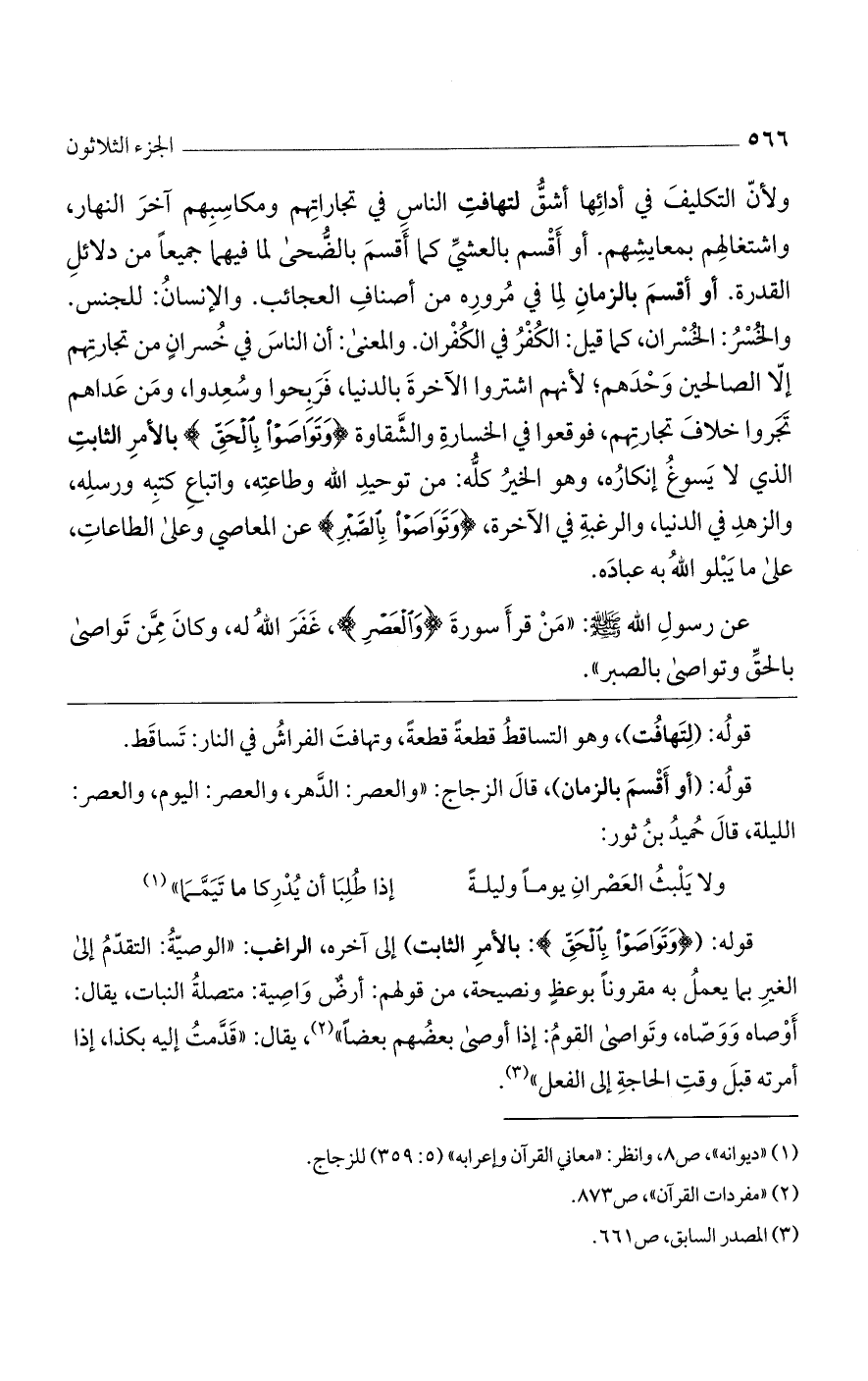 ولأنّ التكليف في أدائها أشق لتهافت الناس في تجاراتهم ومكاسبهم آخر النهار، واشتغالهم بمعايشهم. أو أقسم بالعشي كما أقسم بالضحى لما فيهما جميعًا من دلائل القدرة. أو أقسم بالزمان لما في مروره من أصناف العجائب. والإنسان: للجنس. والخسر: الخسران، كما قيل: الكفر في الكفران. والمعنى: أن الناس في خسران من تجارتهم إلا الصالحين وحدهم؛ لأنهم اشتروا الآخرة بالدنيا، فربحوا وسعدوا، ومن عداهم تجروا خلاف تجارتهم، فوقعوا في الخسارة والشقاوة (وَتَواصَوْا بِالْحَقِّ) بالأمر الثابت الذي لا يسوغ إنكاره، وهو الخير كله: من توحيد الله وطاعته، وإتباع كتبه ورسله، والزهد في الدنيا، والرغبة في الآخرة، (وَتَواصَوْا بِالصَّبْرِ) عن المعاصي وعلى الطاعات، وعلى ما يبلو الله به عباده.