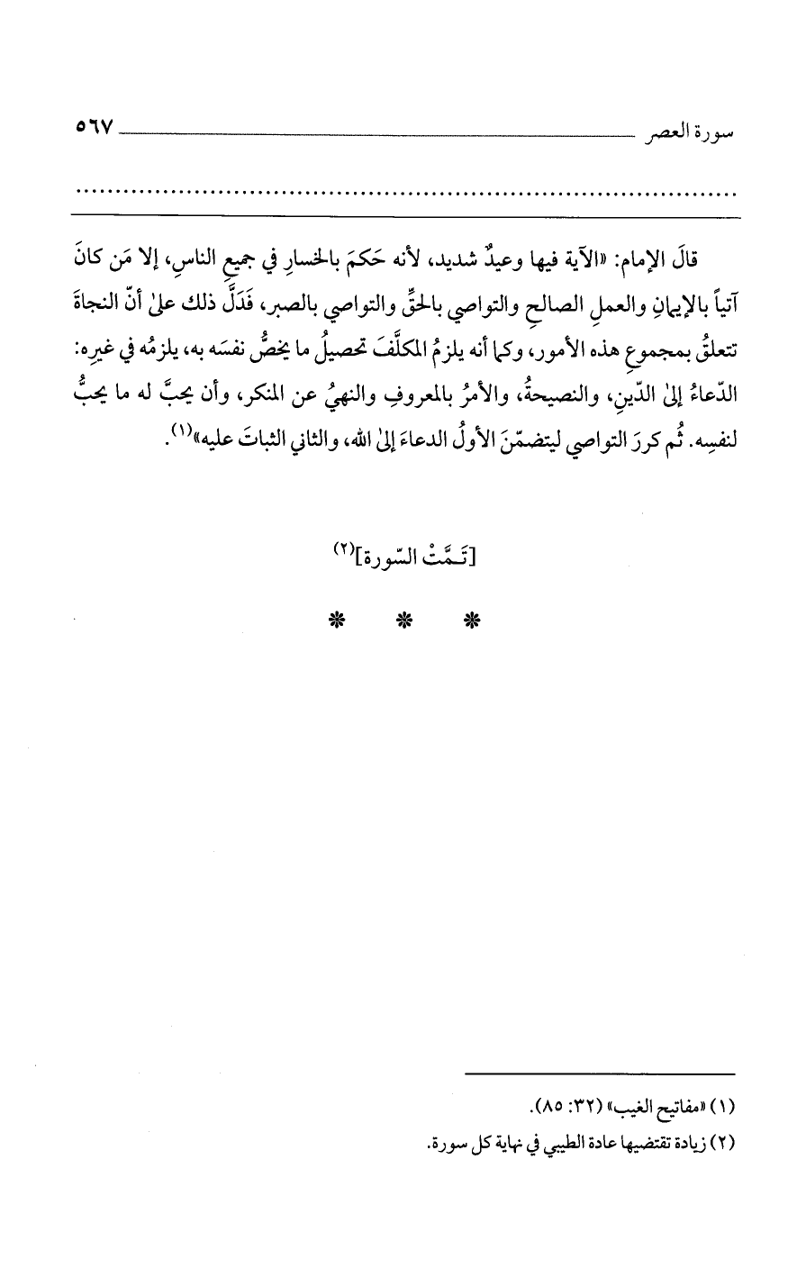 قال الإمام: "الآية فيها وعيد شديد، لأنه حكم بالخسار في جميع الناس، إلا من كان آتياً بالإيمان والعمل الصالح والتواصي بالحق والتواصي بالصبر، فدل ذلك على أن النجاة تتعلق بمجموع هذه الأمور، وكما أنه يلزم المكلف تحصيل ما يخص نفسه به، يلزمه في غيره: الدعاء إلى الدين، والنصيحة، والأمر بالمعروف والنهي عن المنكر، وأن يحب له ما يحب لنفسه. ثم كرر التواصي ليتضمن الأول الدعاء إلى الله، والثاني الثبات عليه".