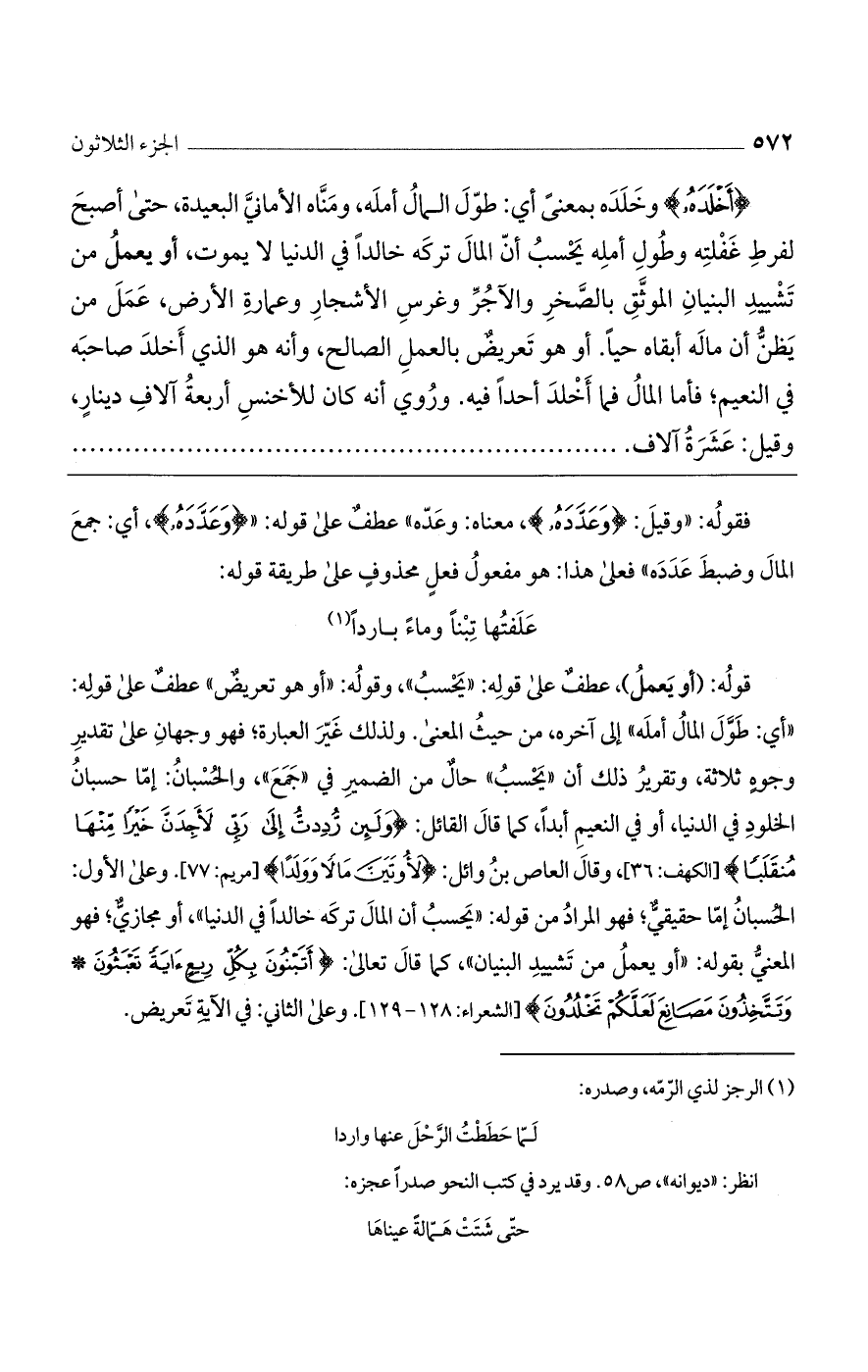 قوله: (أو يعمل)، عطف على قوله: "يحسب"، وقوله: "أو هو تعريض" عطف على قوله: "أي: طول المال أمله"، إلى آخره، من حيث المعنى. ولذلك غير العبارة؛ فهو وجهان على تقدير وجوه ثلاثة، وتقرير ذلك أن "يحسب" حال من الضمير في "جمع"، والحُسبان: إما حسبان الخلود في الدنيا، أو في النعيم أبداً، كما قال القائل: {وَلَئِن رُّدِدتُّ إِلَى رَبِّي لَأَجِدَنَّ خَيْرًا مِّنْهَا مُنقَلَبًا} [الكهف: 36]، وقال العاص بن وائل: {وَقَالَ لَأُوتَيَنَّ مَالًا وَوَلَدًا} [مريم: 77]. وعلى الأول: الحُسبان إما حقيقي؛ فهو المراد من قوله: "يحسب أن المال تركه خالداً في الدنيا"، أو مجازي؛ فهو المعنى بقوله: "أو يعمل من تشييد البنيان"، كما قال تعالى: {أَتَبْنُونَ بِكُلِّ رِيعٍ آيَةً تَعْبَثُونَ (وَتَتَّخِذُونَ مَصَانِعَ لَعَلَّكُمْ تَخْلُدُونَ} [الشعراء: 128 - 129]. وعلى الثاني: في الآية تعريض.