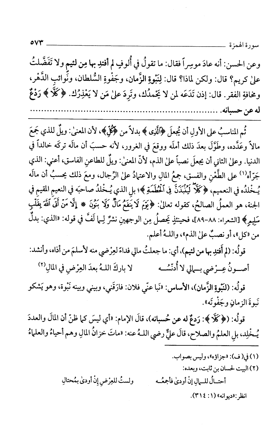 وعن الحسن: أنه عاد موسرًا فقال: ما تقول في ألوف لم أفتد بها من لئيم ولا تفضلت على كريم؟ قال: ولكن لماذا؟ قال: لنبوة الزمان، وجفوة السلطان، ونوائب الدهر، ومخافة الفقر. قال: إذن تدعه لمن لا يحمدك، وترد على من لا يعذرك. (كَلَّا) ردع له عن حسبانه.