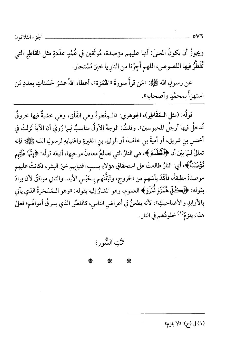 قوله: (مثل المقاطر)، الجوهري: "المقطرة وهي الفلق، وهي خشبة فيها خروق تدخل فيها أرجل المحبوسين". وقلت: الوجه الأول مناسب لما روي أن الآية نزلت في أخنس بن شريق، أو أمية بن خلف، أو الوليد بن المغيرة واغتيابه لرسول الله? ؛ فإنه تعالى لما بين أن {الْحُطَمَةِ}، هي النار التي تطالع معادن موجبها، أتبعه قوله: {إِنَّهَا عَلَيْهِم مُّؤْصَدَةٌ}، أي: النار طالعت على استحقاق هؤلاء بسبب اغتيابهم خير البشر، فكانت عليهم مؤصدة مطبقة، فأكد يأسهم من الخروج، وتيقنهم بحبس الأبد. والثاني موافق لأن يراد بقوله: {لِّكُلِّ هُمَزَةٍ لُّمَزَةٍ} العموم، وهو المشار إليه بقوله: "وهو المسخرة الذي يأتي بالأوابد والأضاحيك"، لأنه يطعن في أعراض الناس، كاللص الذي يسرق أموالهم؛ فعلى هذا، يلزم خلودهم في النار.