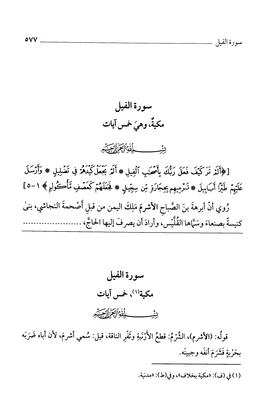 [(أَلَمْ تَرَ كَيْفَ فَعَلَ رَبُّكَ بِأَصْحابِ الْفِيلِ (1) أَلَمْ يَجْعَلْ كَيْدَهُمْ فِي تَضْلِيلٍ (2) وَأَرْسَلَ عَلَيْهِمْ طَيْراً أَبابِيلَ (3) تَرْمِيهِمْ بِحِجارَةٍ مِنْ سِجِّيلٍ (4) فَجَعَلَهُمْ كَعَصْفٍ مَاكُولٍ)] 1_ 5 [