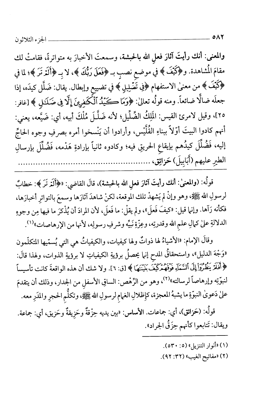 قوله: (والمعنى: أنك رأيت آثار فعل الله بالحبشة)، قال القاضي: " {أَلَمْ تَرَ}: خطاب لرسول الله? ، وهو وإن لم يشهد تلك الموقعة، لكن شاهد آثارها وسمع بالتواتر أخبارها، فكأنه رآها. وإنما قيل: "كيف فعل"، ولم يقل: ما فعل، لأن المراد أن يُذكر ما فيها من وجوه الدلالة على كمال علم الله وقدرته، وعزة نبيه وشرف رسوله، لأنها من الإرهاصات".