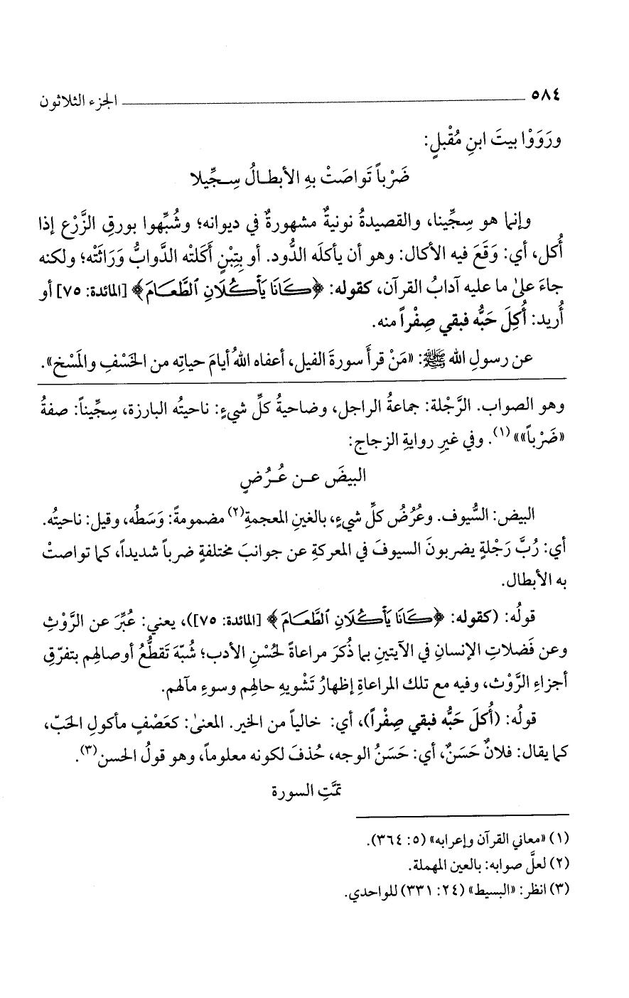 وإنما هو سجينا، والقصيدة نونية مشهورة في ديوانه؛ وشبهوا بورق الزرع إذا أكل، أي: وقع فيه الأكال: وهو أن يأكله الدود. أو بتبن أكلته الدواب وراثته؛ ولكنه جاء على ما عليه آداب القرآن، كقوله: (كانا يَاكُلانِ الطَّعامَ)] المائدة: 75 [أو أريد: أكل حبه فبقى صفرًا منه.