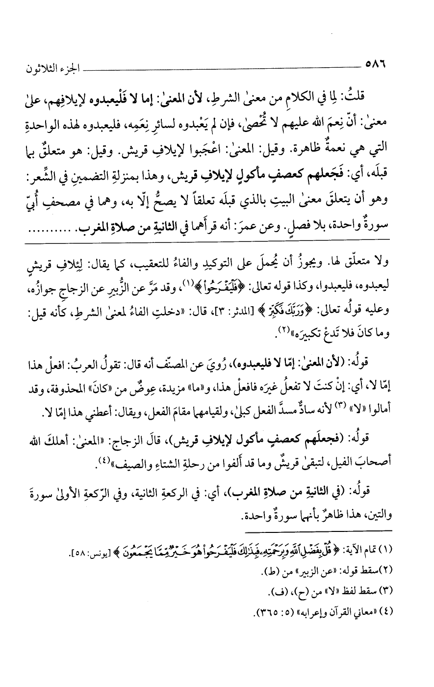 قلت: لما في الكلام من معنى الشرط، لأن المعنى: إما لا فليعبدوه لإيلافهم، على معنى: أنّ نعم الله عليهم لا تحصى، فإن لم يعبدوه لسائر نعمه، فليعبدوه لهذه الواحدة التي هي نعمة ظاهرة. وقيل: المعنى: اعجبوا لإيلاف قريش. وقيل: هو متعلق بما قبله، أي: فجعلهم كعصٍف مأكول لإيلاف قريش، وهذا بمنزلة التضمين في الشعر: وهو أن يتعلق معنى البيت بالذي قبله تعلقا لا يصح إلا به، وهما في مصحف أبىّ سورة واحدة، بلا فصل. وعن عمر: أنه قراهما في الثانية من صلاة المغرب.