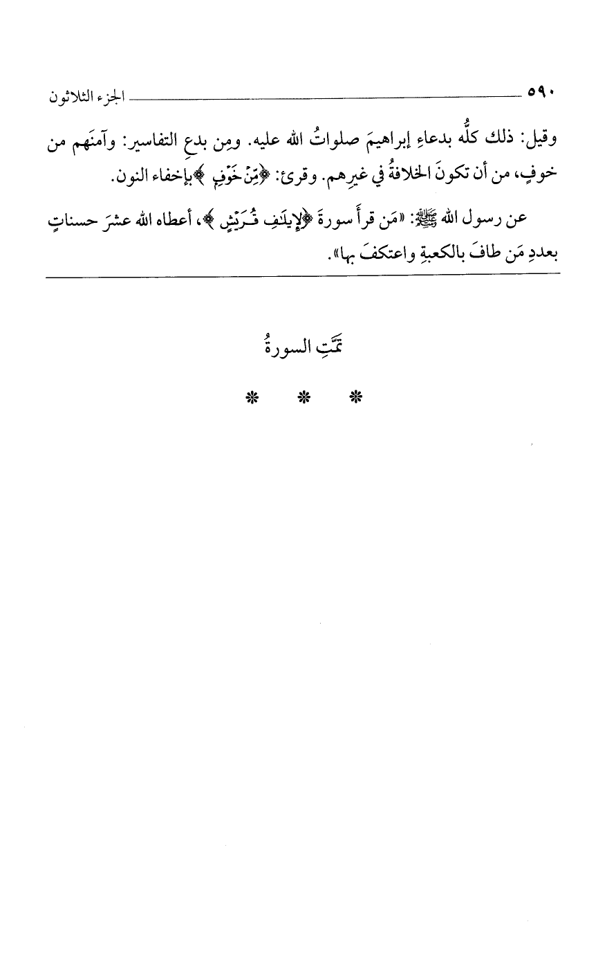عن رسول الله صلى الله عليه وسلم: «من قرأ سورة (لإيلاف قريش)، أعطاه الله عشر حسنات بعدد من طاف بالكعبة واعتكف بها».