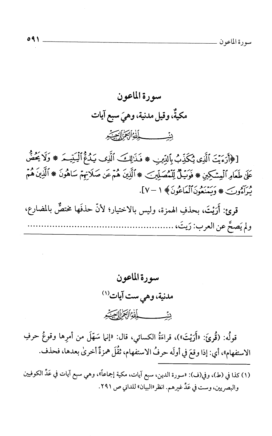 [(أَرَأَيْتَ الَّذِي يُكَذِّبُ بِالدِّينِ (1) فَذلِكَ الَّذِي يَدُعُّ الْيَتِيمَ (2) وَلا يَحُضُّ عَلى طَعامِ الْمِسْكِينِ (3) فَوَيْلٌ لِلْمُصَلِّينَ (4) الَّذِينَ هُمْ عَنْ صَلاتِهِمْ ساهُونَ (5) الَّذِينَ هُمْ يُراؤُنَ (6) وَيَمْنَعُونَ الْماعُونَ)] 1 - 7 [