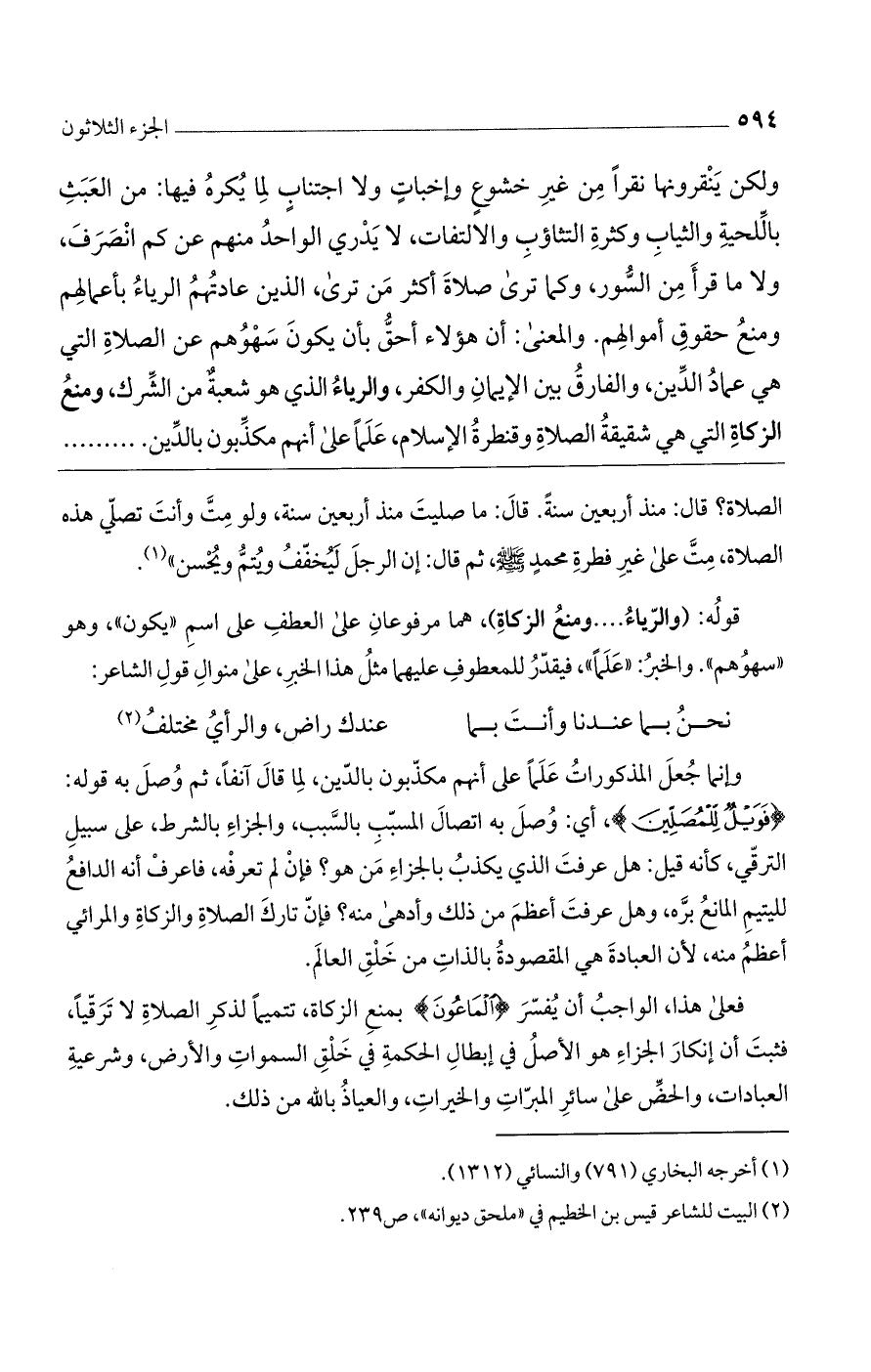 فعلى هذا، الواجب أن يفسر {الْمَاعُونَ} بمنع الزكاة، تتميماً لذكر الصلاة لا ترقياً، فثبت أن إنكار الجزاء هو الأصل في إبطال الحكمة في خلق السموات والأرض، وشرعية العبادات، والحض على سائر المبرات والخيرات، والعياذ بالله من ذلك.