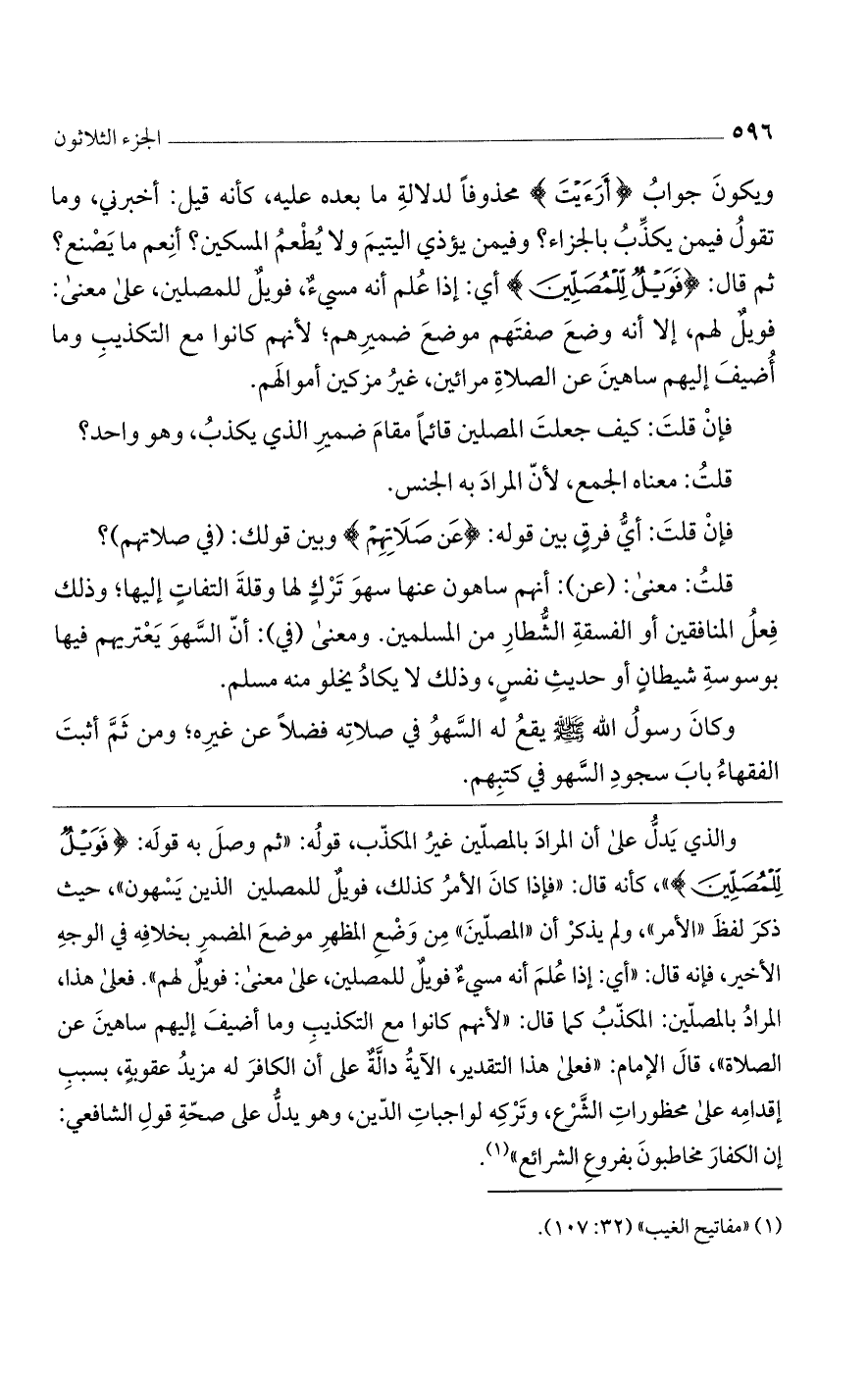 والذي يدل على أن المراد بالمصلين غير المكذب، قوله: "ثم وصل به قوله: {فَوَيْلٌ لِّلْمُصَلِّينَ} "، كأنه قال: "فإذا كان الأمر كذلك، فويل للمصلين الذين يسهون"، حيث ذكر لفظ "الأمر"، ولم يذكر أن "المصلين" من وضع المظهر موضع المضمر بخلافه في الوجه الأخير، فإنه قال: "أي: إذا عُلم أنه مسيء فويل للمصلين، على معنى: فويل لهم". فعلى هذا، المراد بالمصلين: المكذب كما قال: "لأنهم كانوا مع التكذيب وما أضيف إليهم ساهين عن الصلاة"، قال الإمام: "فعلى هذا التقدير، الآية دالة على أن الكافر له مزيد عقوبة، بسبب إقدامه على محظورات الشرع، وتركه لواجبات الدين، وهو يدل على صحة قول الشافعي: إن الكفار مخاطبون بفروع الشرائع".