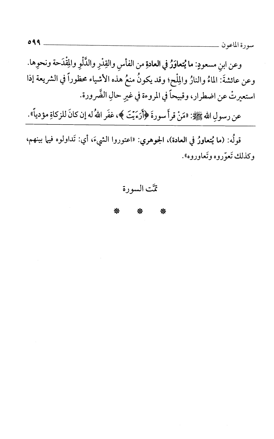 وعن ابن مسعود: ما يتعاون في العادة من الفأس والقدر والدلو والمقدحة ونحوها. وعن عائشة: الماء والنار والملح؛ وقد يكون منع هذه الأشياء محظورًا في الشريعة إذا استعيرت عن اضطرار، وقبيحًا في المروءة في غير حال الضرورة.