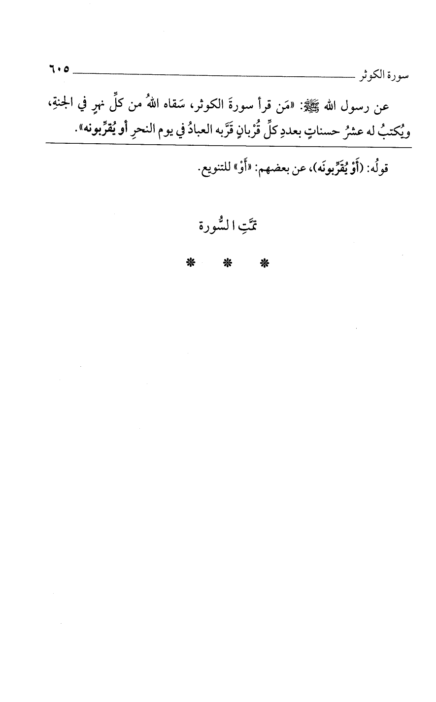 عن رسول الله صلى الله عليه وسلم: «من قرأ سورة الكوثر، سقاه الله من كل نهر في الجنة، ويكتب له عشر حسنات بعدد كل قربان قربه العباد في يوم النحر أو يقربونه».