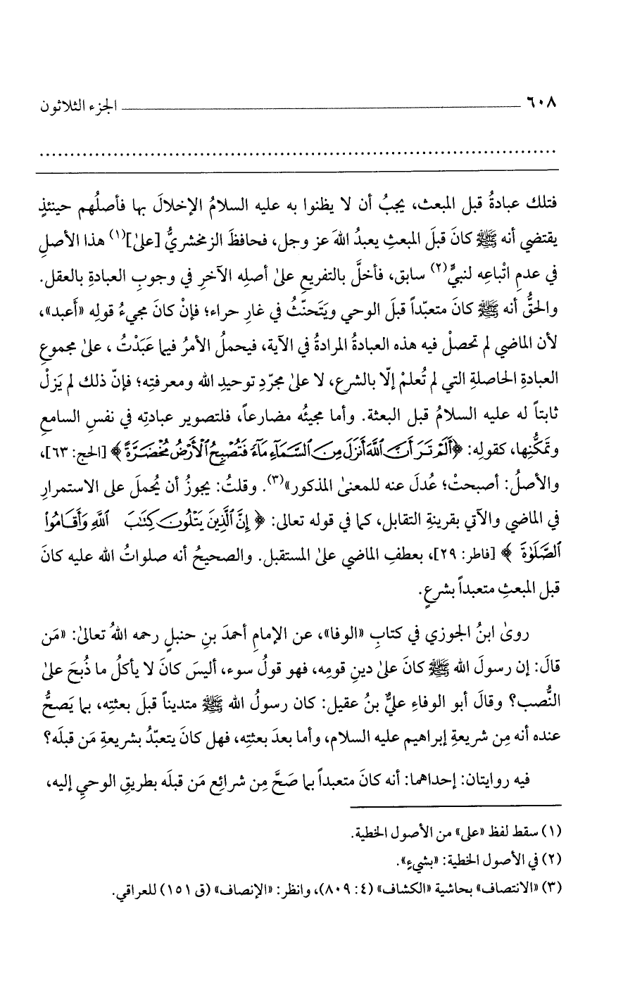 روى ابنُ الجوزي في كتابِ "الوفا"، عن الإمامِ أحمدَ بنِ حنبلٍ رحمه اللهُ تعالى: «مَن قالَ: إن رسولَ الله -صلى الله عليه وسلم- كانَ على دينِ قومِه، فهو قولُ سوء، أليسَ انَ لا يأكلُ ما ذُبحَ على النُّصب؟ وقالَ أبو الوفاءِ عليٌّ بنُ عقيل: كان رسولُ الله -صلى الله عليه وسلم- متدينًا قبلَ بعثتِه، بما يَصحُّ عنده أنه مِن شريعةِ إبراهيم عليه السلام، وأما بعدَ بعثتِه، فهل كانَ يتعبّدُ بشريعةِ مَن قبلَه؟