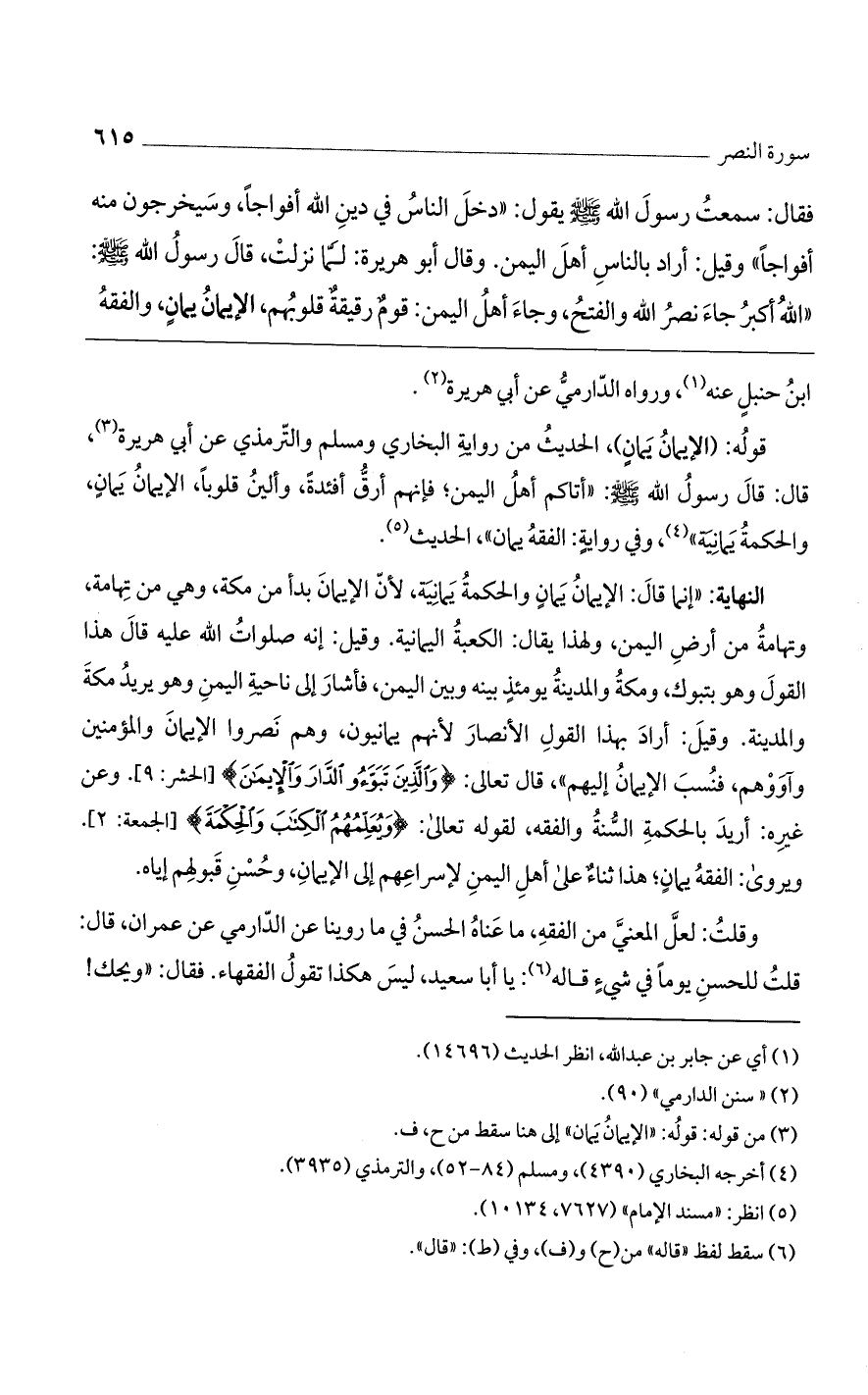 فقال: سمعت رسول الله صلى الله عليه وسلم يقول: «دخل الناس في دين الله أفواجًا، وسيخرجون منه أفواجًا» وقيل: أراد بالناس أهل اليمن. قال أبو هريرة: لما نزلت، قال رسول الله صلى الله عليه وسلم: «الله أكبر جاء نصر الله والفتح، وجاء أهل اليمن: قوم رقيقة قلوبهم، الإيمان يمان، والفقه