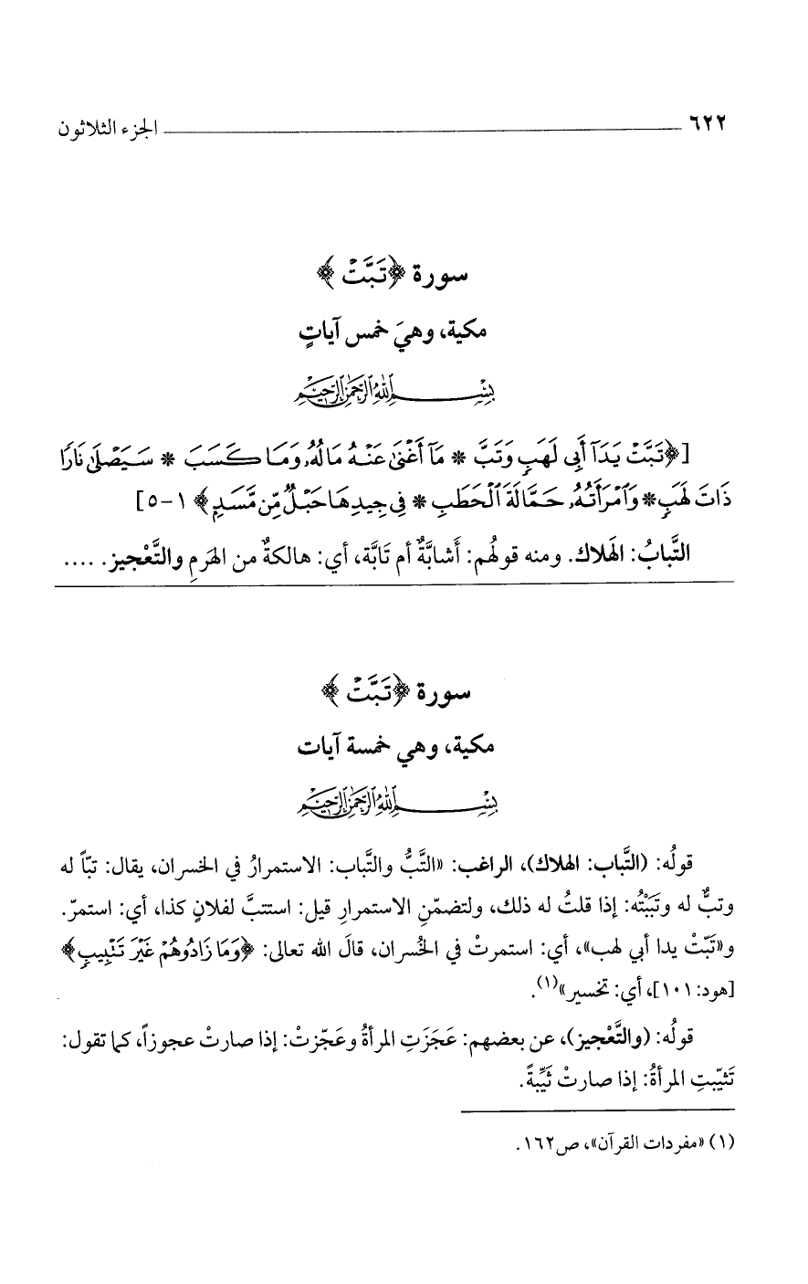 [(تَبَّتْ يَدا أَبِي لَهَبٍ وَتَبَّ (1) ما أَغْنى عَنْهُ مالُهُ وَما كَسَبَ (2) سَيَصْلى ناراً ذاتَ لَهَبٍ (3) وَامْرَأَتُهُ حَمَّالَةَ الْحَطَبِ (4) فِي جِيدِها حَبْلٌ مِنْ مَسَدٍ)] 1 - 5 [