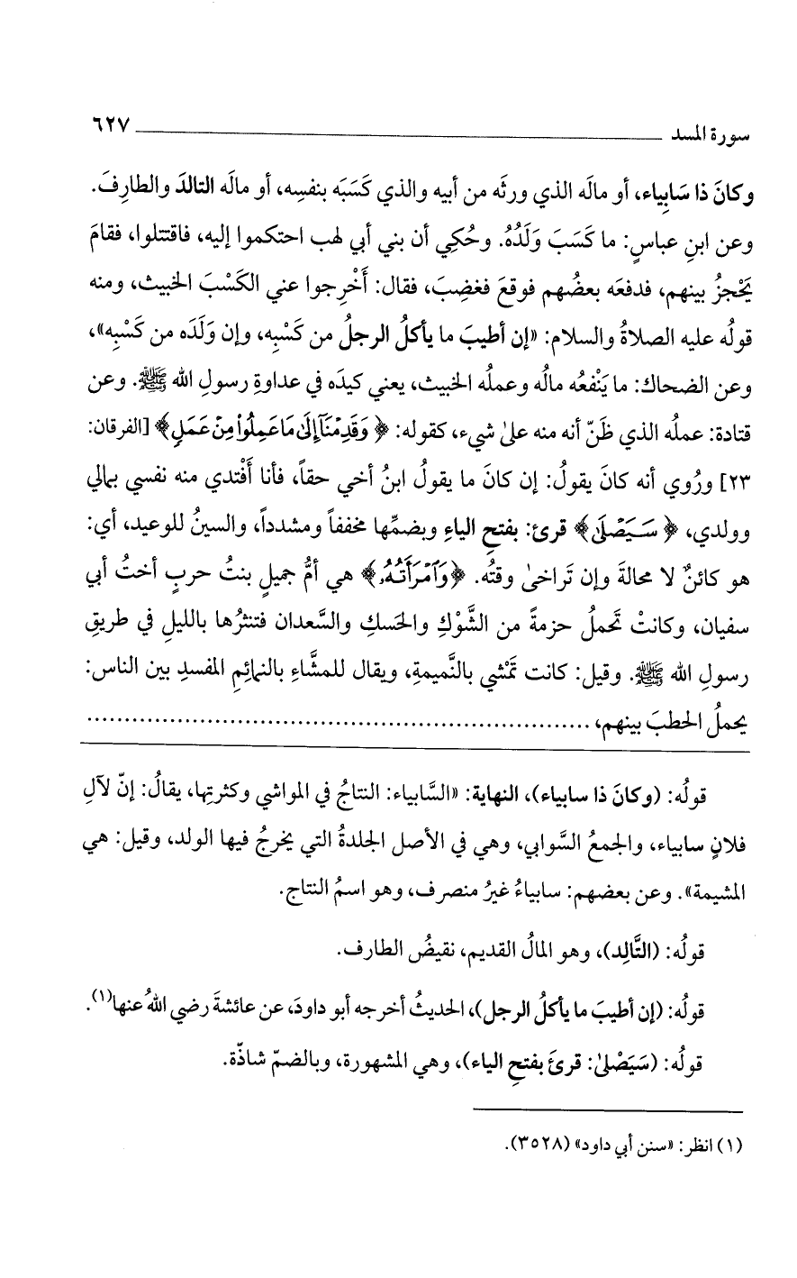 وكان ذا سابياء، أو ماله الذي ورثه من أبيه والذي كسبه بنفسه، أو ماله التالد والطارف. وعن ابن عباس: ما كسب ولده. وحكي أن بني أبى لهب احتكموا إليه، فاقتتلوا، فقام يحجز بينهم، فدفعه بعضهم فوقع فغضب، فقال: أخرجوا عنى الكسب الخبيث، ومنه قوله عليه الصلاة السلام: «إن أطيب ما يأكل الرجل من كسبه، وإن ولده من كسبه»، وعن الضحاك: ما ينفعه ماله وعمله الخبيث، يعنى كيده في عداوة رسول الله صلى الله عليه وسلم. وعن قتادة: عمله الذي ظن أنه منه على شيء، كقوله: (وَقَدِمْنا إِلى ما عَمِلُوا مِنْ عَمَلٍ)] الفرقان: 23 [وروى أنه كان يقول: إن كان ما يقول ابن أخي حقًا، فأنا أفتدى منه نفسي بمالي وولدي، (سَيَصْلى) قرئ: بفتح الياء وبضمها مخففًا ومشددًا، والسين للوعيد، أي: هو كائن لا محالة وإن تراخى وقته. (وَامْرَأَتُهُ) هي أم جميل بنت حرب أخت أبى سفيان، وكانت تحمل حزمة من الشوك والحسك والسعدان فتنثرها بالليل في طريق رسول الله صلى الله عليه وسلم. وقيل: كانت تمشى بالنميمة، ويقال للمشاء بالنمائم المفسد بين الناس: يحمل الحطب بينهم،