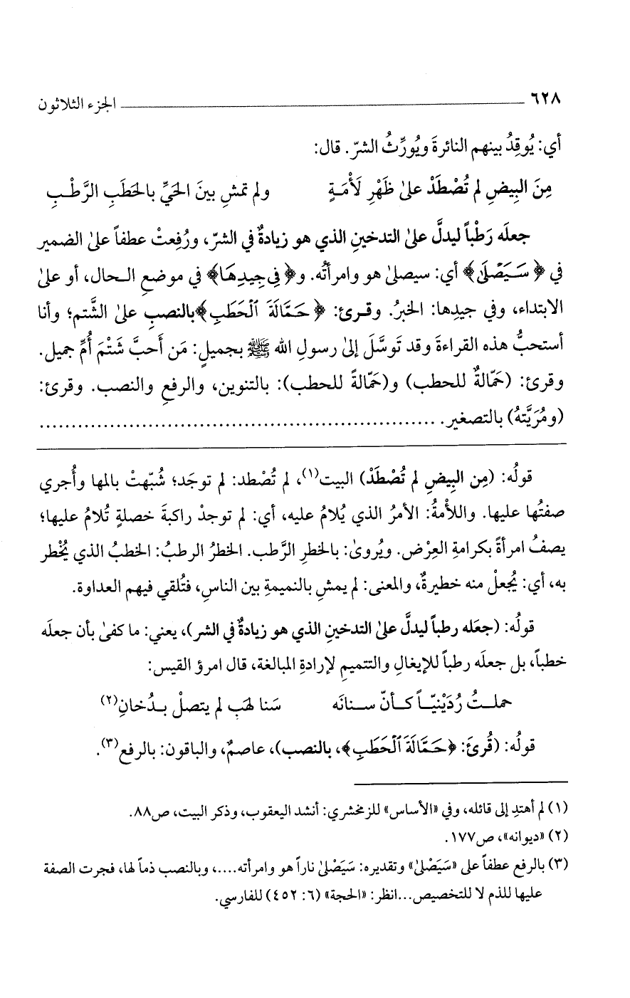 جعله رطبًا ليدل على التدخين الذي هو زيادة في الشر، ورفعت عطفًا على الضمير في سَيَصْلى أي: سيصلى هو وامرأته. و (فِي جِيدِها) في موضع الحال، أو على الابتداء، وفي جيدها: الخبر. وقرئ: (حمالة الحطب) بالنصب على الشتم؛ وأنا أستحب هذه القراءة وقد توسل إلى رسول الله صلى الله عليه وسلم بجميل: من أحب شتم أم جميل. وقرئ: (حمالة للحطب) و (حمالة للحطب): بالتنوين، والرفع والنصب. وقرئ: (ومريته) بالتصغير.