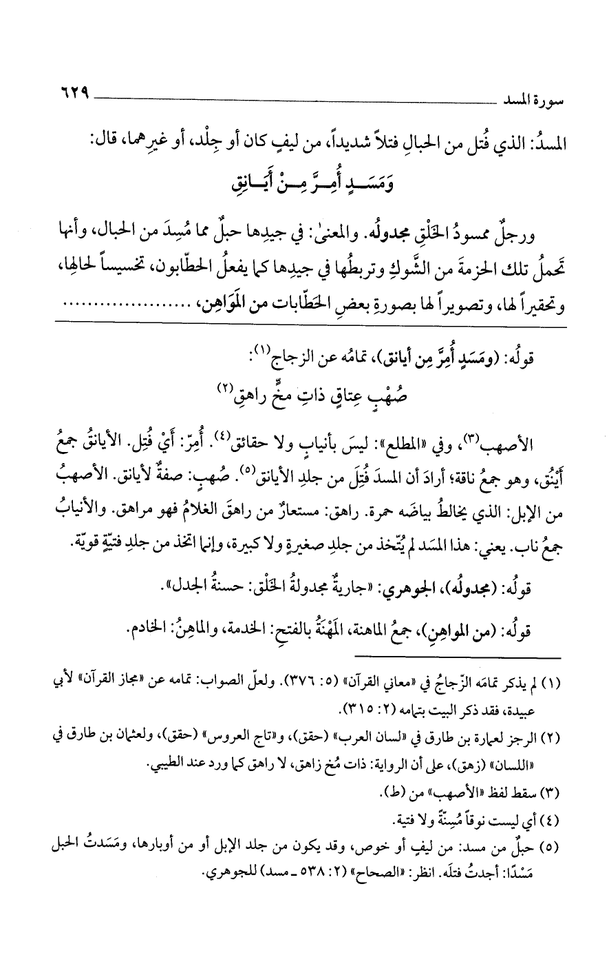 ورجل ممسود الخلق مجدوله. والمعنى: في جيدها حبل مما مسد من الحبال، وأنها تحمل تلك الحزمة من الشوك وتربطها في جيدها كما يفعل الحطابون، تخسيسًا لحالها، وتحقيرًا لها، وتصويرًا لها بصورة بعض الحطابات من المواهن،