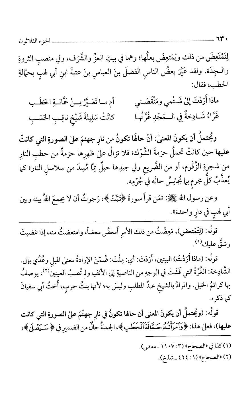 لتمتعض من ذلك ويمتعض بعلها؛ وهما في بيت العز والشرف، وفي منصب الثروة والجدة. ولقد عير بعض الناس الفضل بن العباس بن عتبة ابن أبى لهب بحمالة الحطب، فقال